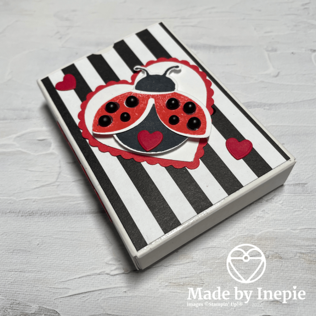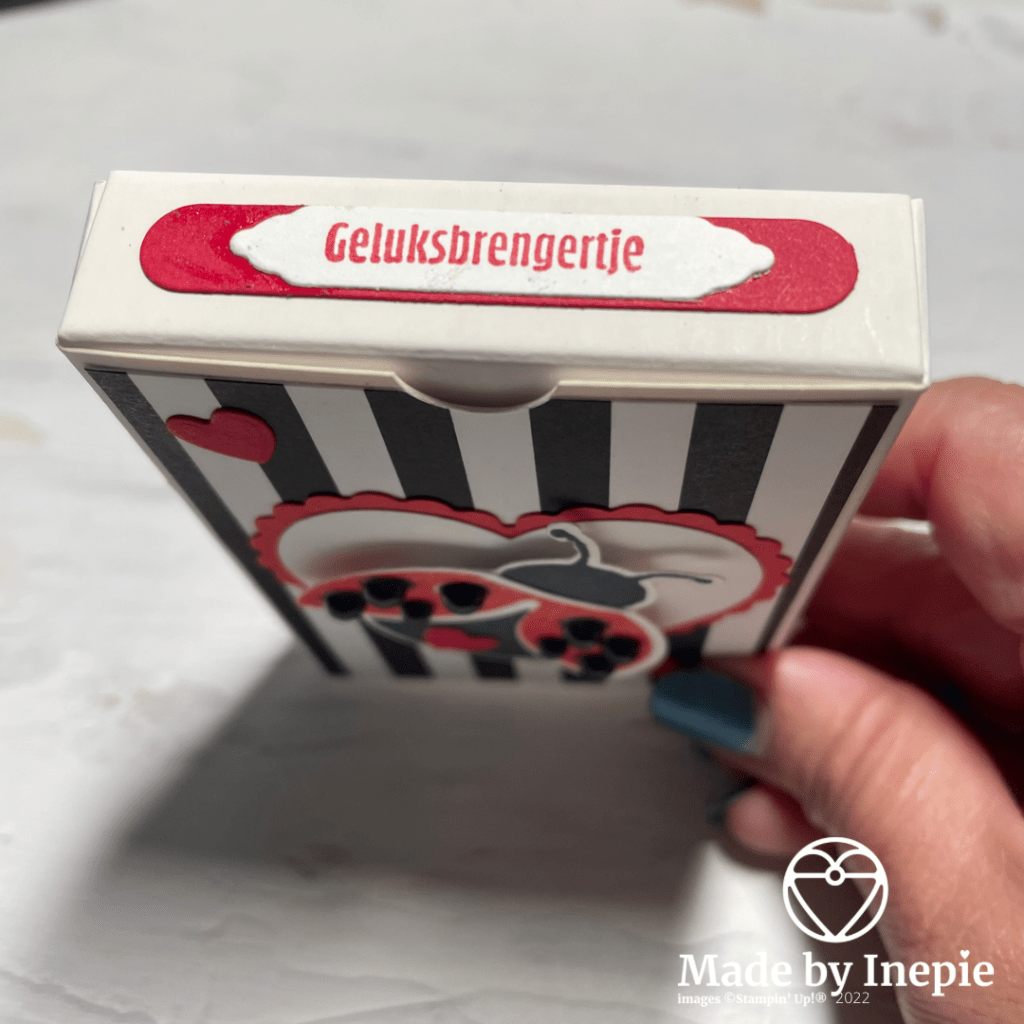 Ik heb de Ladybug bundel gebruikt ( stempelset plus pons) maar dan de Nederlandse versie: Geluksbrengertjes. De stipjes zijn Matte Black Dots. En ook heb ik de twee hartponsen gebruikt. De kleine hartjes heb ik gemaakt met de Sweet Heart Dies.