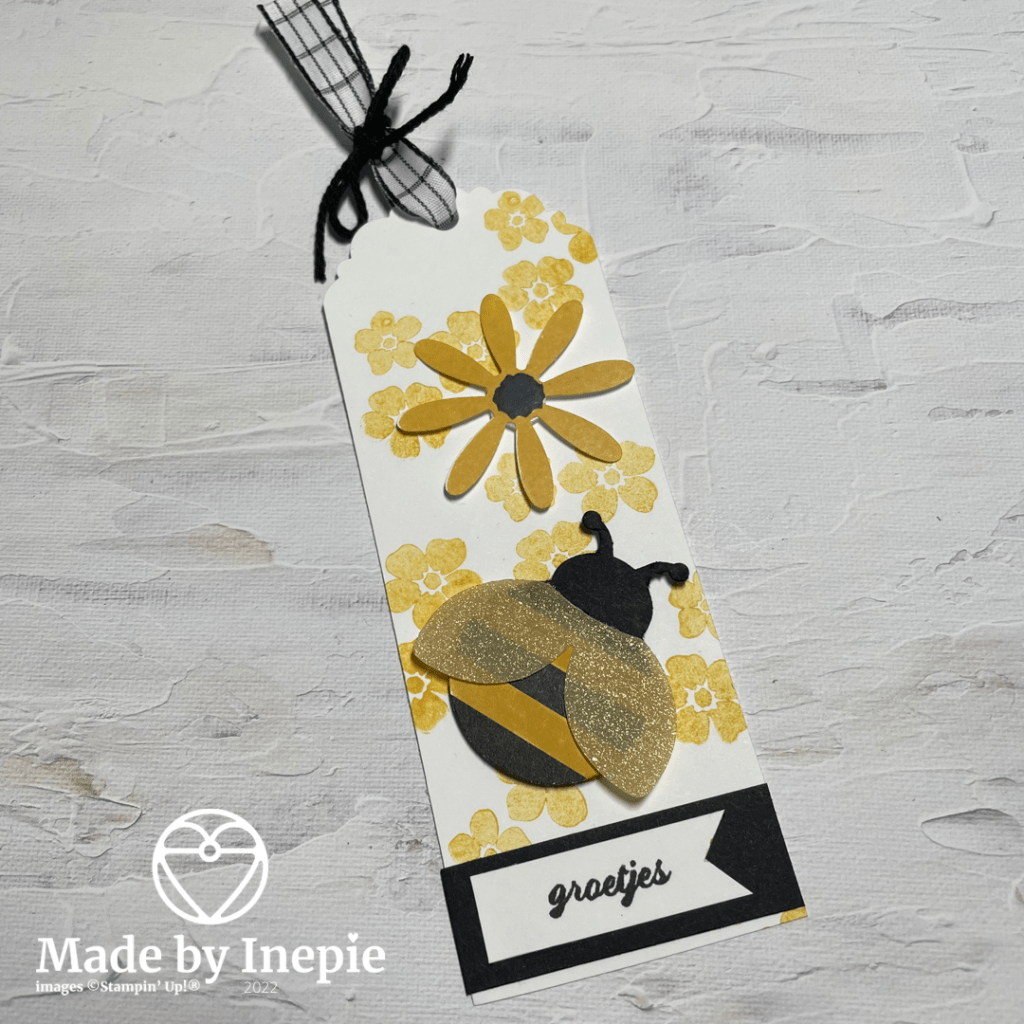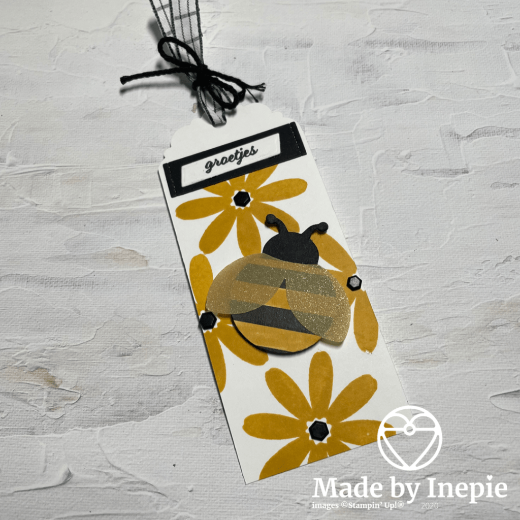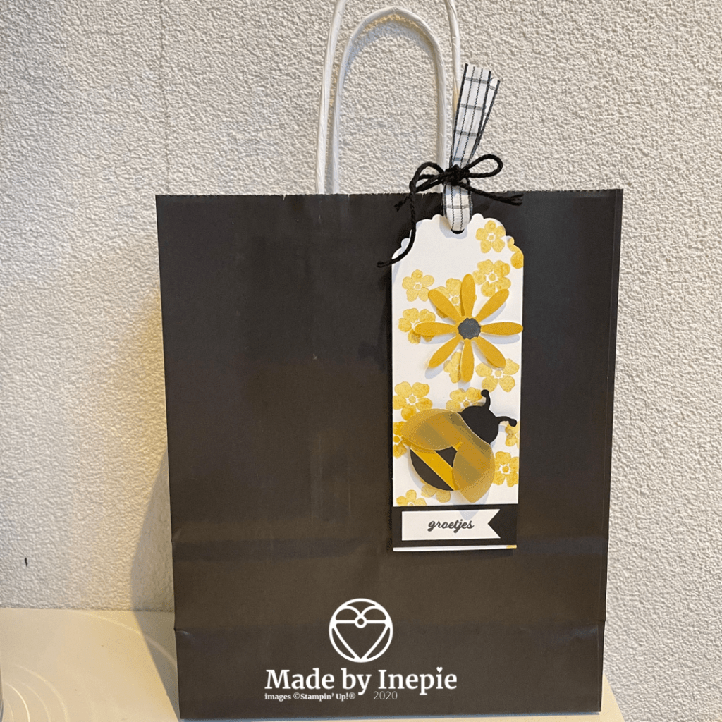 Wow super snel had ik mijn bestelling binnen. Maandagavond besteld en vandaag al binnen. Dus kon ik mijn klantenbestellingen klaar gaan maken. Ik maak altijd een mooie kaart of label als dank je wel cadeautje. Deze keer heb ik labels gemaakt met de mooie bundel Geluksbrengertjes. Die lag nog op mijn bureau van het doosjes van gisteren. Alleen deze keer maakte ik er geen lieveheersbeestje van maar een schattig bijtje. Ik heb eerst met de pons de lijfjes uit Basic Black cardstock geponst. En daarna uit zwart wit gestreept Pattern Party Dsp. Je kunt ook het All Together Dsp gebruiken. De strepen heb ik met een Bumblebee Stampin Write Marker ingekleurd. En daarna de vleugels uit Goud vellum geponst. Zo’n mooi effect. Ik kwam er pas later achter dat deze retired is maar het In Color Shimmer Vellum is nog wel te bestellen.