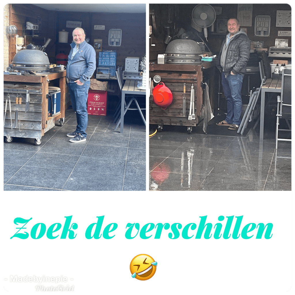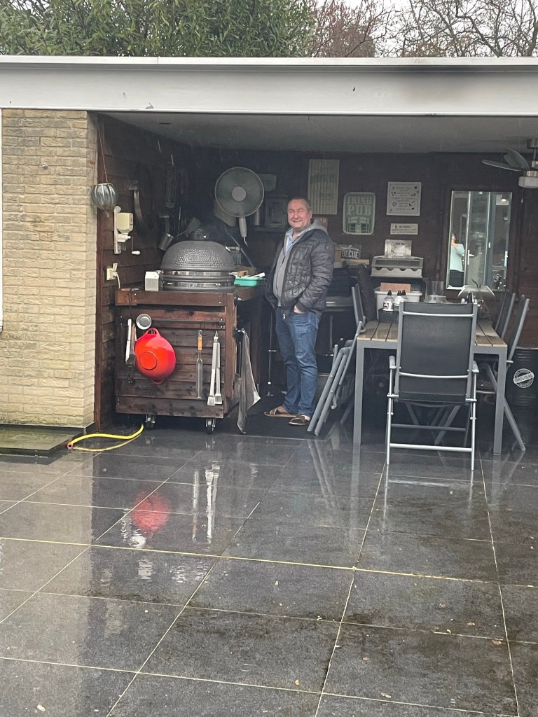 Je kunt veel zeggen over mijn Willem maar hij blijft altijd lachen, zelfs in de stromende regen is hij druk bezig met zijn hobby: bbq-en. Hij heeft Spare ribs op de Grizzly liggen. En dat heeft tijd, liefde en aandacht nodig. En dan maakt het hem niet uit dat het met bakken uit de lucht komt.