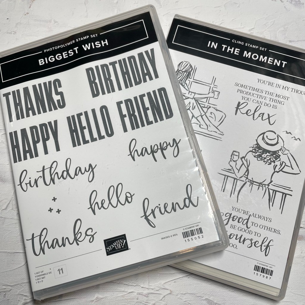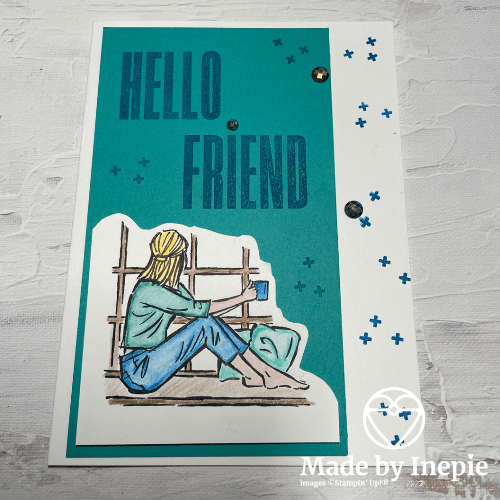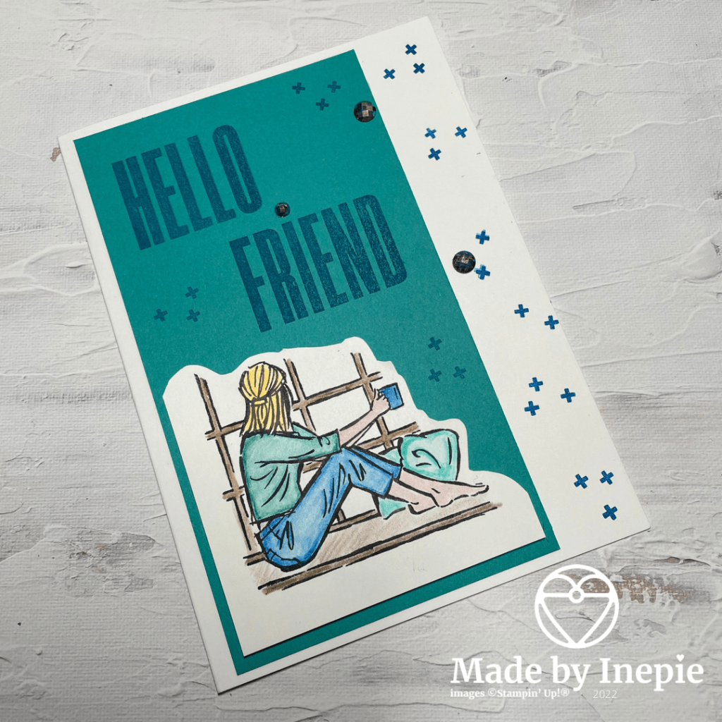 De mooie grote teksten komen uit de set Biggest Wish en ook het het hele kleine achtergrond stempeltje heb ik gebruikt. Daar heb ik los uit de pols mee gestempeld terwijl ik de Hello Friend met mijn Stamparatus heb gestempeld. Zodat het mooi recht op de kaart kwam. Ik heb de stempels maar 1 keer beinkt want anders vond ik het te donker worden en te hard. Terwijl de stempel afdruk van de vrouw juist iets dromerigs heeft.