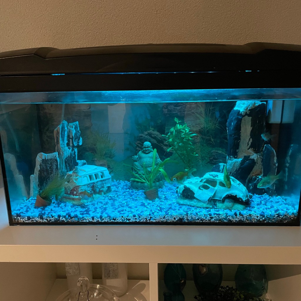 De VW kever was mijn overleden mans eerste auto en Willem is helemaal weg van zo’n oude VW busje dus gezamenlijk staan deze twee te pronken in ons aquarium. De Boedah hebben we van Nick gekregen: de deugd in het midden haha.