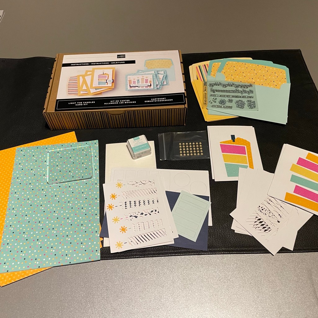 Voor Doosjes Donderdag heb ik de nieuwste creatieve kaartmaak kit genomen. De mooie Light The Candles kit. Je maakt hiermee 8 kaarten ( 2 designs) en alle materialen plus enveloppen zitten in de doos. Zelfs een clear block stempels en een mini inktpad. Super leuk met vrolijke kleuren.