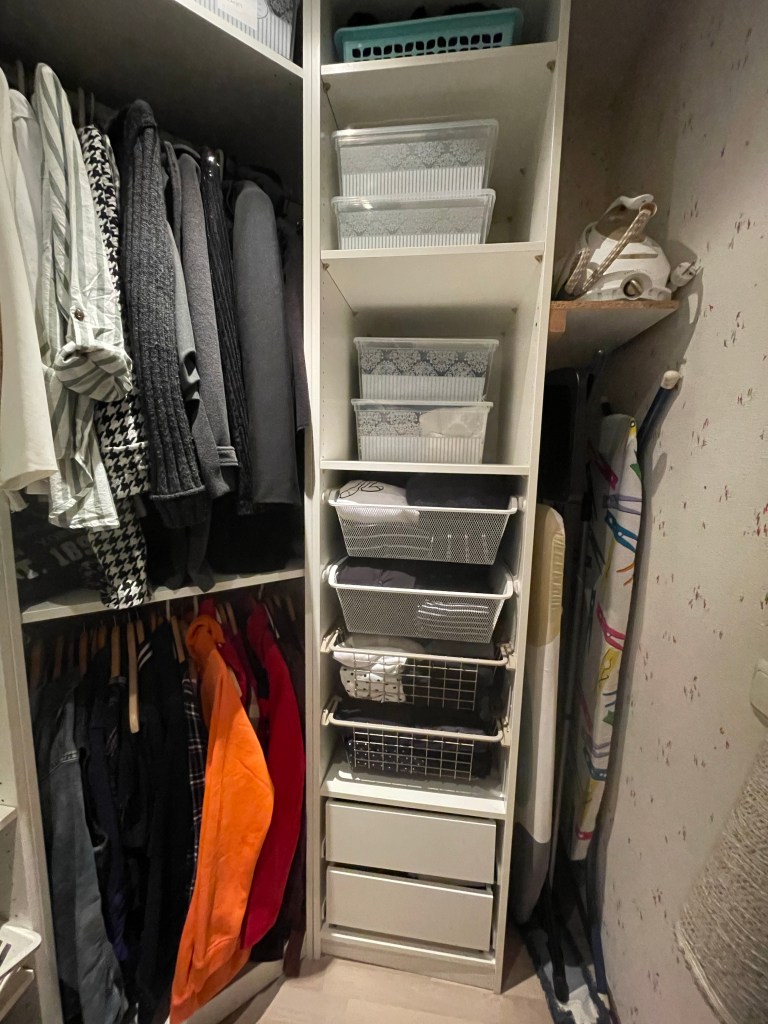 Toen de planken in de inloopkast leeggehaald. We hadden vorige week bij Ikea manden en laden bijgekocht. En vandaag heeft Willem ze geplaatst.
