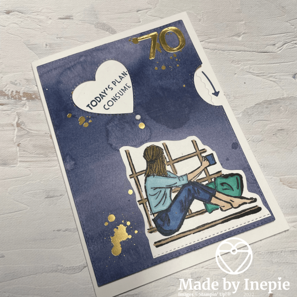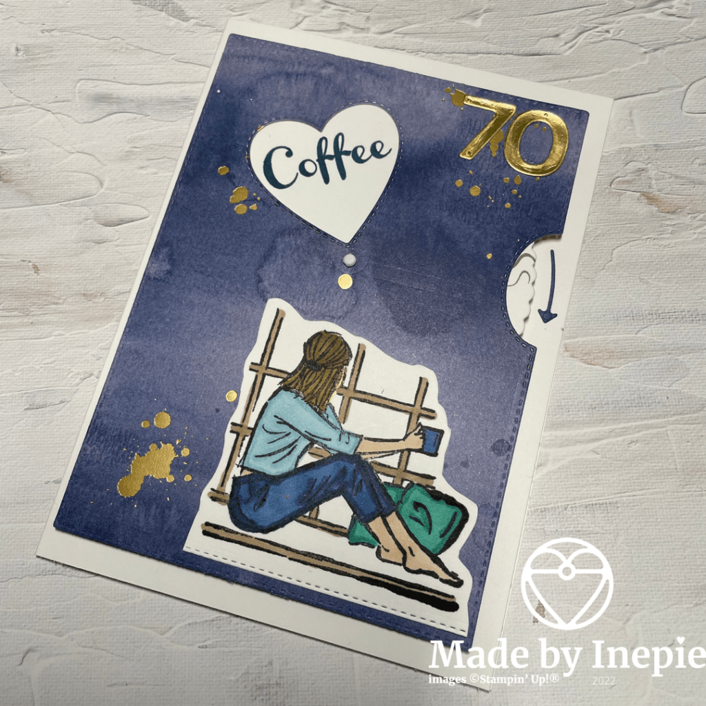 Een super mooie kaart met de Give it a Whirl Dies. De teksten komen uit de Nothing Better Than stempelset. En de mooie afdruk van de vrouw met koffie is van de In The Moment stempelset en die heb ik ingekleurd met mijn Stampin Blends.