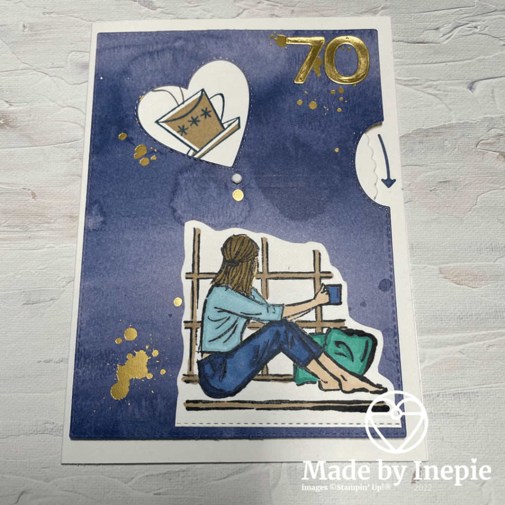 Vrijdag werd mijn oudste zus Hilly 70. Wij schelen 10 jaar, ja het is echt: ik word in april 60 jaar. Tussen ons zitten nog een broer en twee zussen en na mij komt nog een broertje. We doen eigenlijk niet meer aan cadeaus maar voor dit kroonjaar besloten we een gezamenlijk cadeau te geven en wel een koffiezetapparaat. Ik zou het kaartje maken en dit is het geworden:
