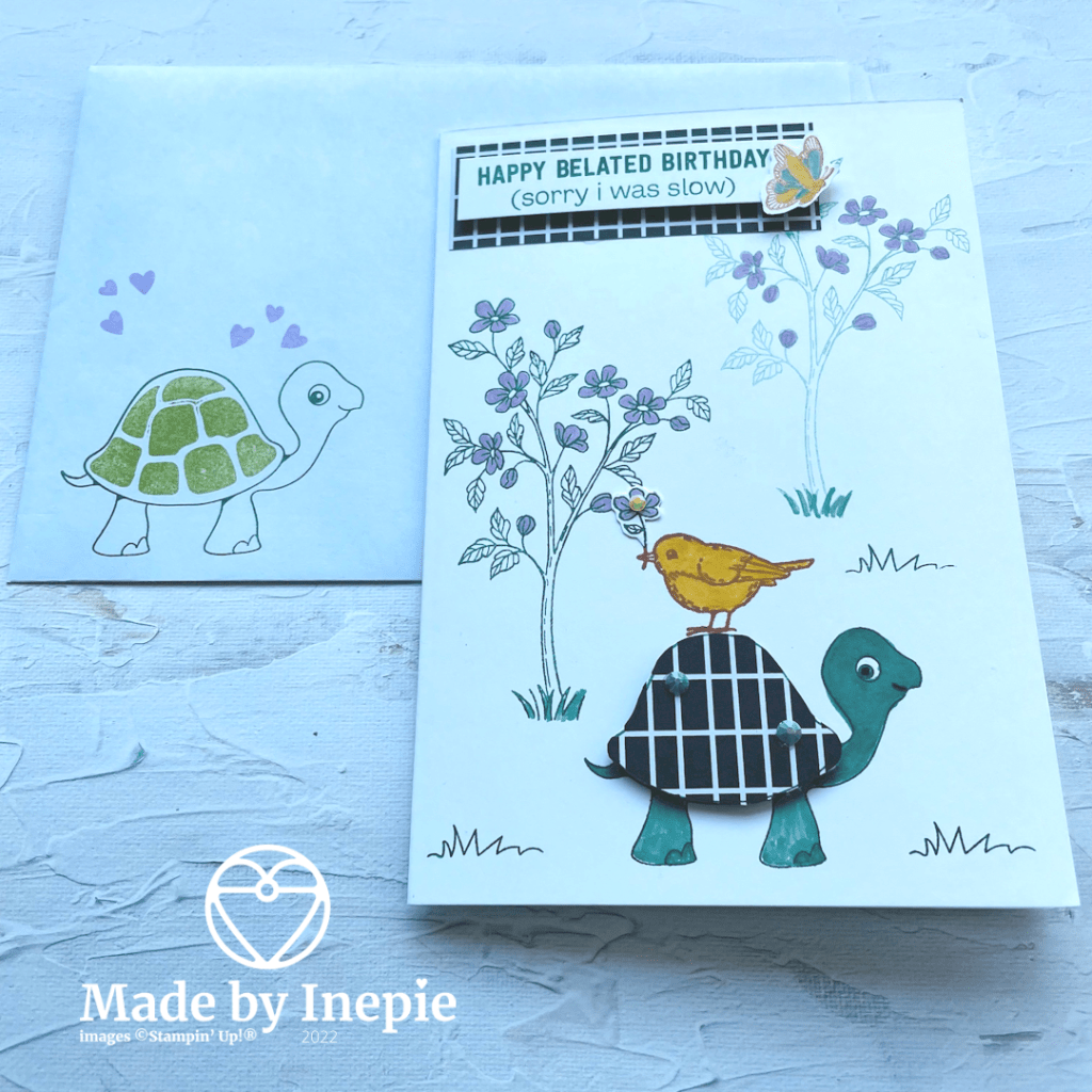 De envelop heb ik ook bestempeld en op de binnenkant heb ik een kleine schildpad gestempeld. Zo past het mooi bij elkaar en de ontvangster was er erg blij mee. Deze twee stempelsets zijn super cute en dus mooi te combineren. En je kunt ze bij mij bestellen.
