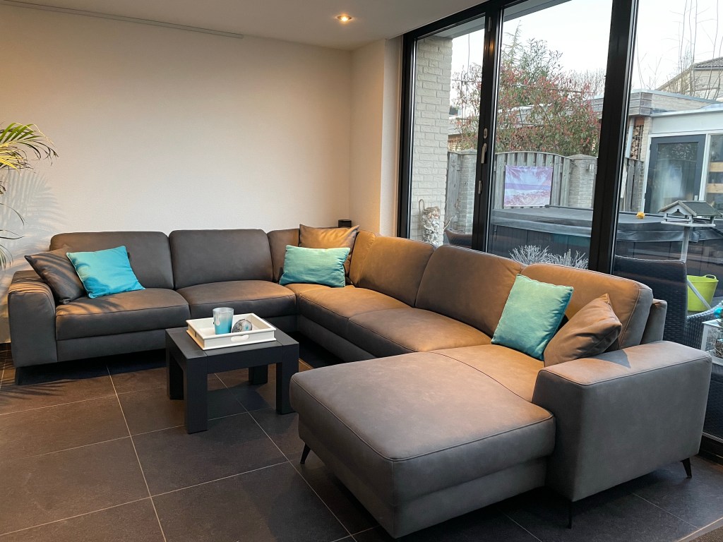 Gelukkig passen mijn turquoise kussens er perfect bij en zit hij heerlijk, dus erg blij ermee. Voor het eerst geen leren bank maar een stoffen.