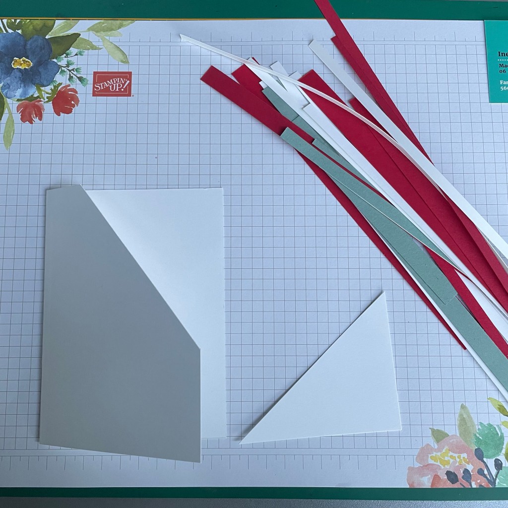 In mijn restjes bak had ik veel strookjes Real Red cardstock en Soft Succulent. Ik besloot om van een basiskaart een hoek af te snijden. Ik ben begonnen om aan de binnenkant de strookjes op te plakken. Daarna ging ik door op de voorkant.
