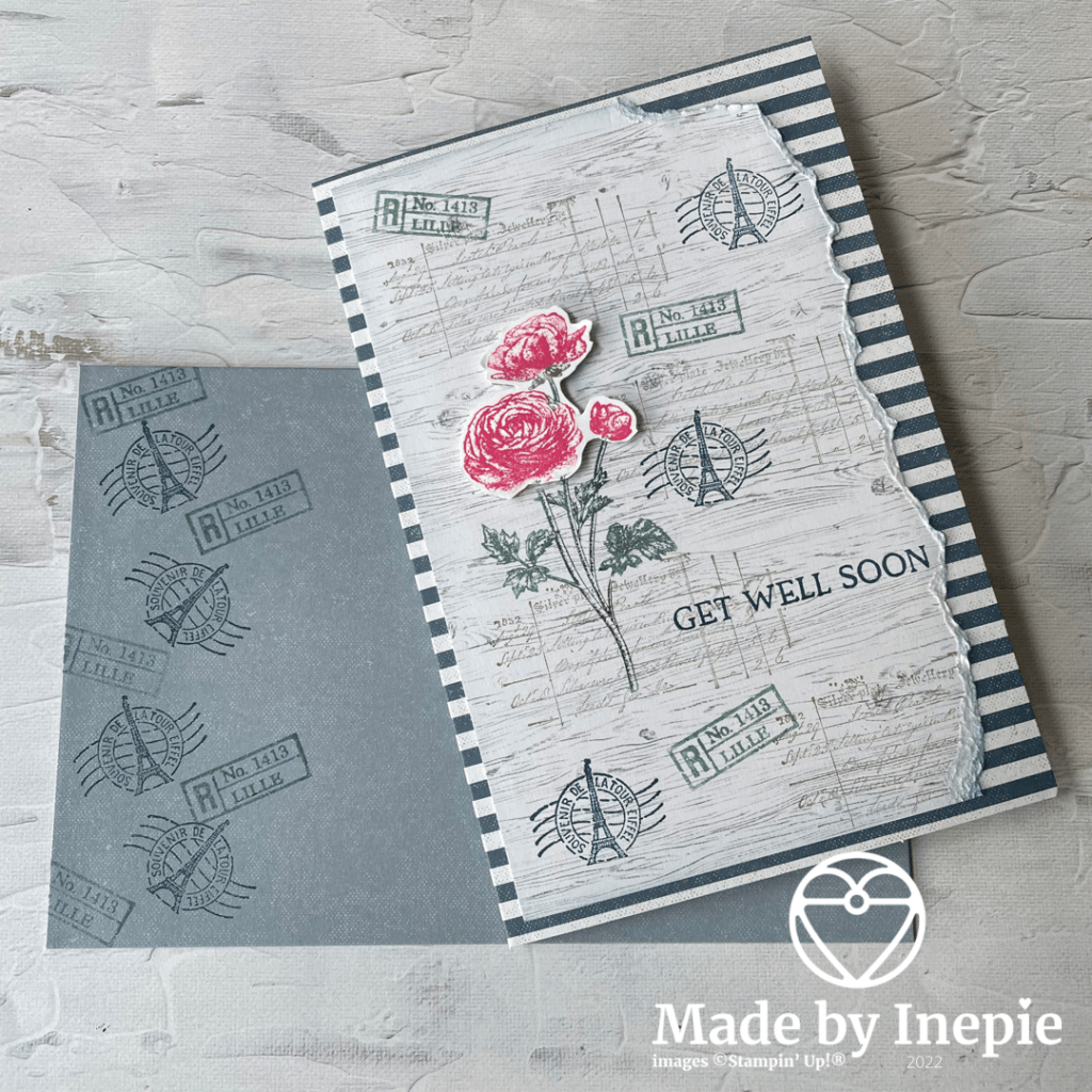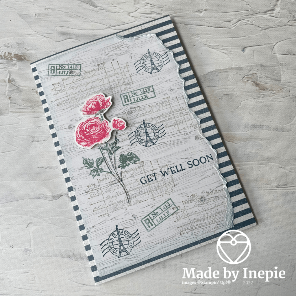 Vandaag een hele makkelijke basis: een kaart en envelop die al zo mooi zijn van zichzelf met die mooie strepen. Om op stempelen pakte ik een kaart uit de bijpassende Heart & Home Memories & More card pack. Die houten planken vond ik perfect passen bij de sfeer van de Ranunculus Romance stempelset die ik wilde gebruiken.