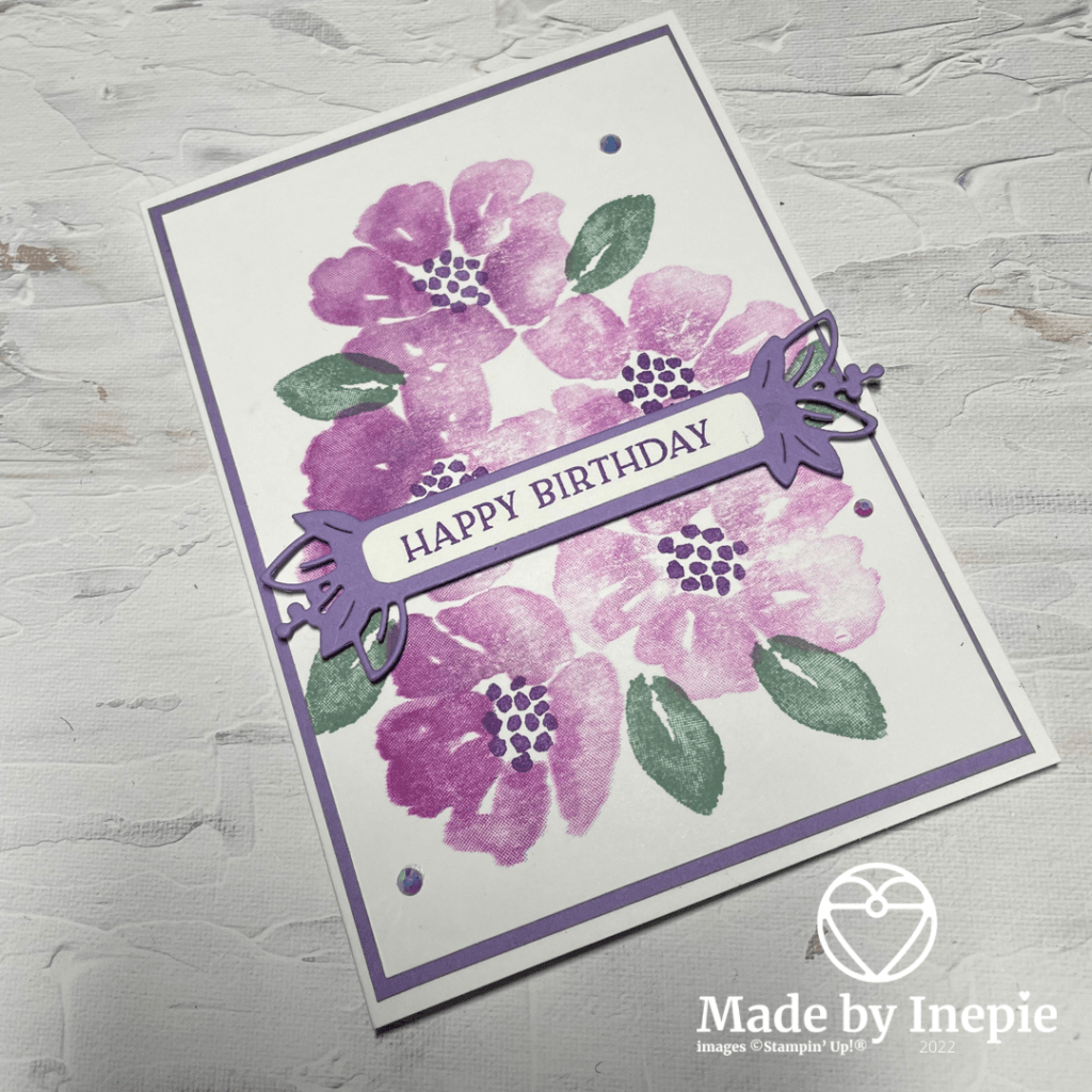 Ik heb voor dit kaartje de stempelset Blossoms in Bloom gebruikt. De grote stempel op mijn Stamparatus blad gedaan en toen met een Blending Brush Highland Heather en Magenta Madness kleur aangebracht. Door de Blending Brush wordt de kleur veel zachter. Toen met een spongedauber Gorgeous Grape inkt aangebracht. En deze twee stappen herhaald tot ik blij was met het eindresultaat. Hier is de Stamparatus ideaal voor. Zo’n fijn apparaat!