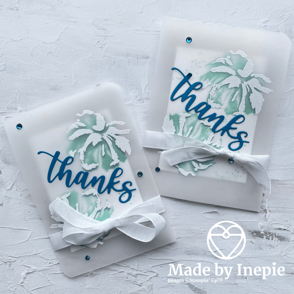 Voor onze video hop heb ik ge-inspireerd door Jennifer McGuire een Vellum Overlay card gemaakt. De basiskaart is een stuk Vellum van 28 cm bij 10 cm score op 14 cm. Binnenin zit een klein kaartje van Basic White van 7 cm bij 20 cm score op 10 cm. Meer heb je niet nodig dan wat stempels en misschien een stukje lint. En natuurlijk de producten om te heat embossen. Dus een heat tool, Versamark en embossing poeder. Ik vind dit echt een super leuk model kaart. Je kunt de formaten gewoon zelf aanpassen aan wat jij mooi vindt. Het derde kaartje wat ik liet zien heb ik op dezelfde manier gemaakt alleen heb ik de Poppies ingekleurd met Stampin Blends. En heb ik de ander Thanks stans ook gebruikt.