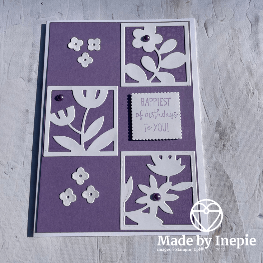 Deze fleurige kaart heb ik dus gemaakt met de Floral Square Dies en de bijbehorende All Squared Away stempelset. Ik heb op een Basic White basiskaart een mat geplakt van Highland Heather cardstock daar 3 vierkanten opgestempeld en daarbovenop de 3 stansjes. De tekst komt ook uit de stempelset en deze heb ik uitgestanst met de Layering Squares. Dit stansje heb ik met Dimensionals opgeplakt.