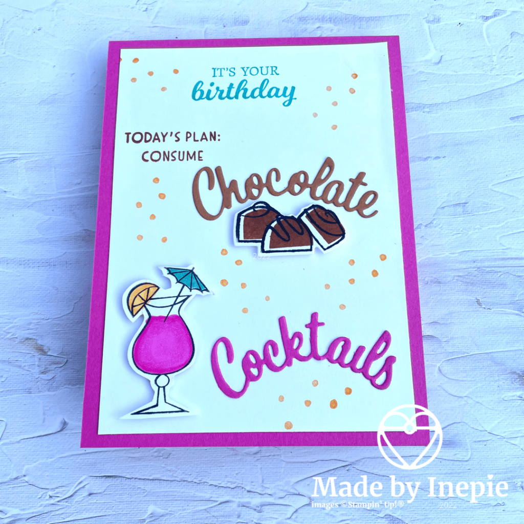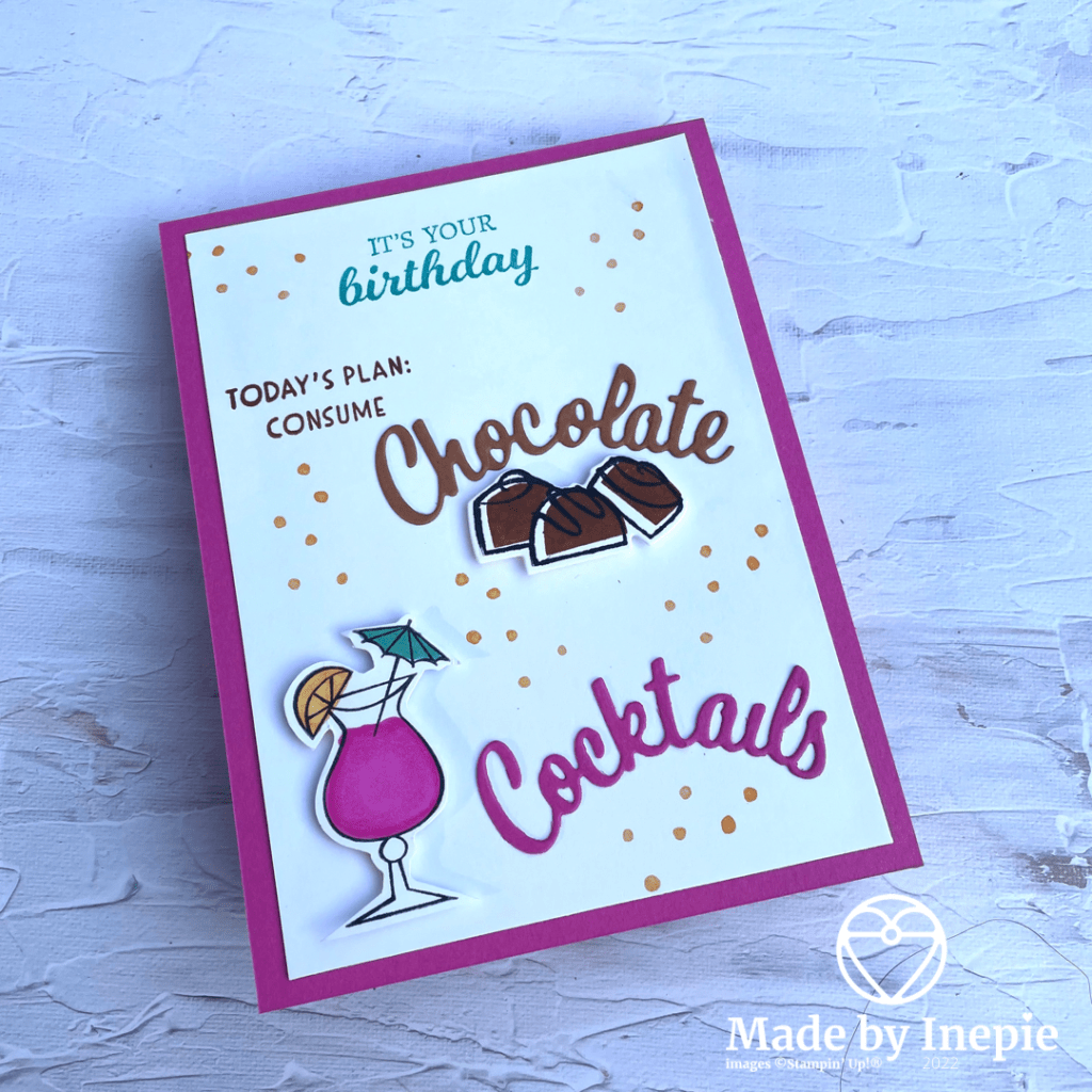 De voorkant is gemaakt met een mat van 9,5 cm bij 13,5 cm Basic White cardstock. Hier heb ik de tekst opgestempeld en met de bijbehorende stansen de woorden Chocolate en Cocktails uitgestanst. De chocolade en het cocktail glas heb ik gestempeld en uitgestanst en toen met Dimensionals opgeplakt. Omdat ik het te leeg vond heb ik nog met een klein stippenstempeltje uit de Dressed to Impress set wat stipjes in Mango Melody inkt aangebracht. Ik vind het een super zonnig kaartje geworden en Sanne was er blij mee.