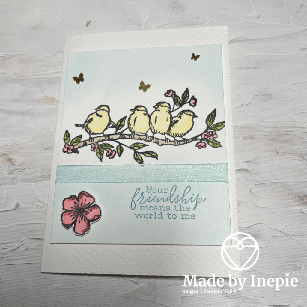 Deze prachtige stempelset gaat ons nu toch echt verlaten. Hij is nu in de aanbieding van €27,00 voor €21,60. Ik vind de vogels zo schattig en dacht dan ook: vandaag ga ik er een mooi lenteachtig kaartje mee maken.