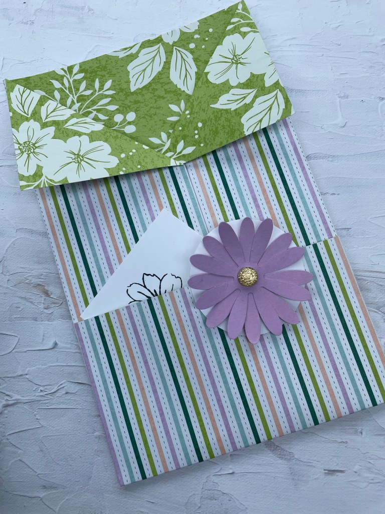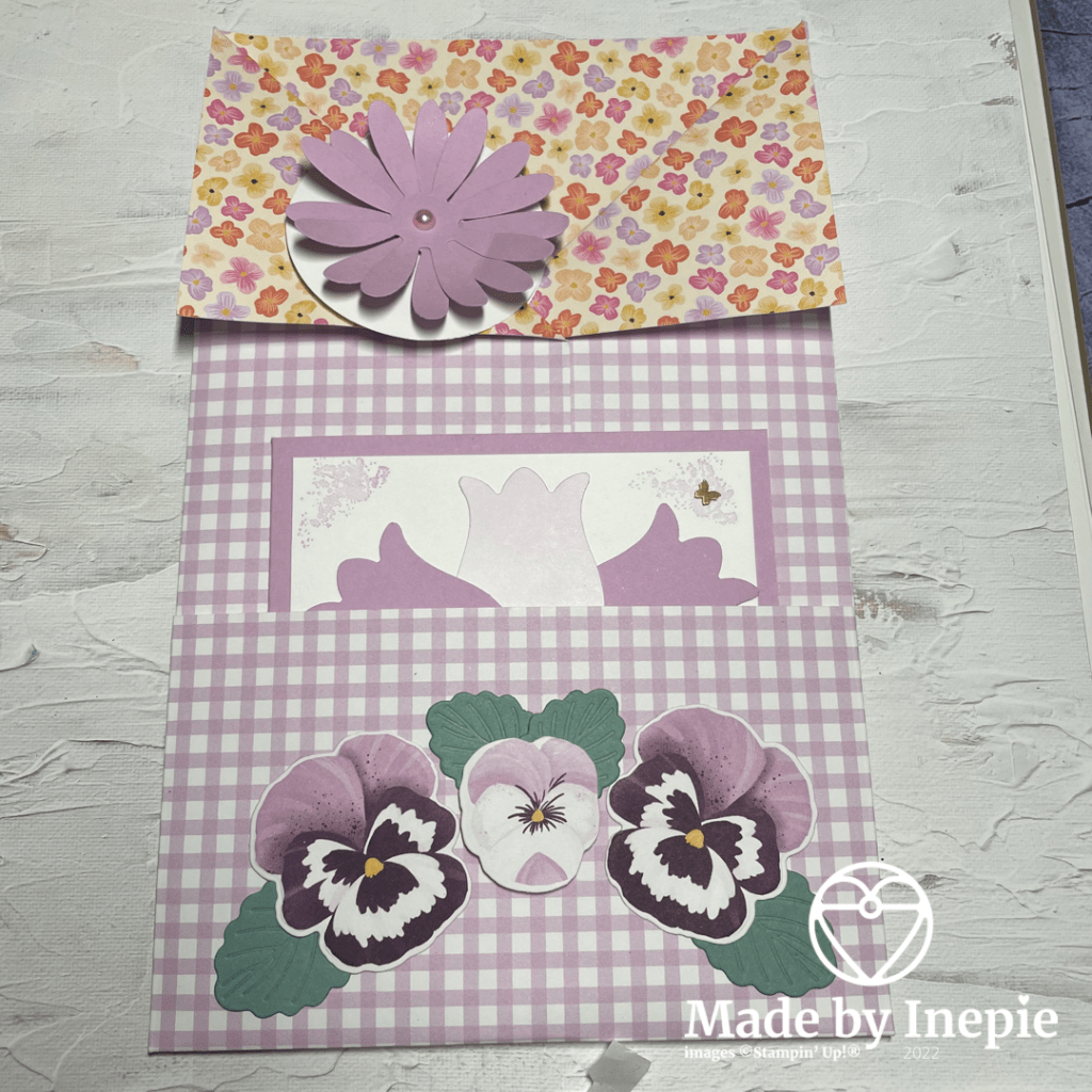 Dit was mijn voorbeeld versie met de Vrolijke Viooltjes. De Daisy is een boekenlegger en kan je ervan afhalen. Erin zit de kaart die ik hier vrijdag al heb laten zien.