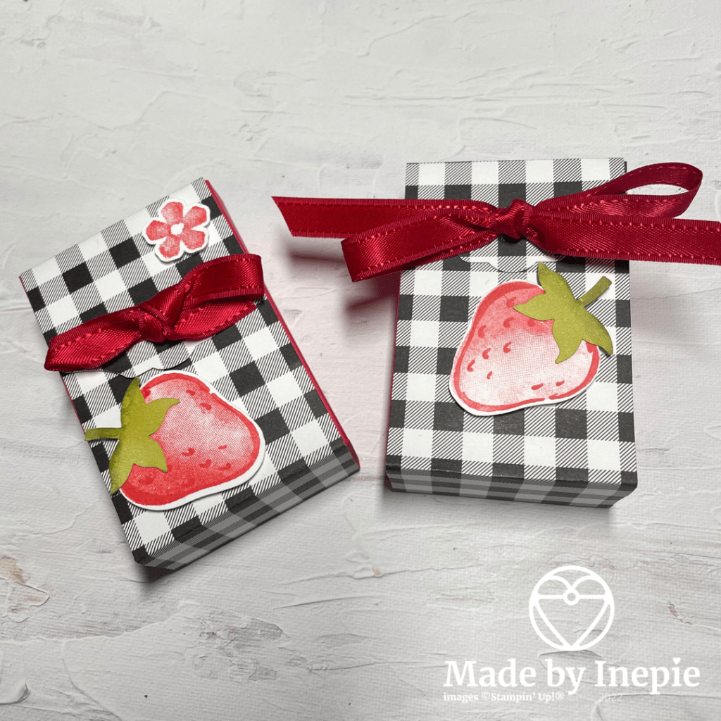Schattig toch dat zwart witte papier met de rode aardbeien en het rode lint.