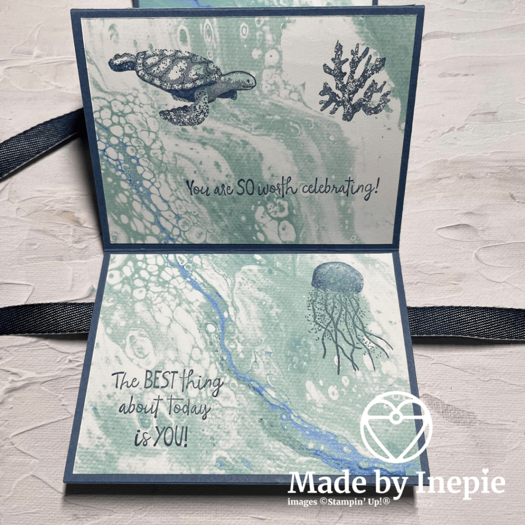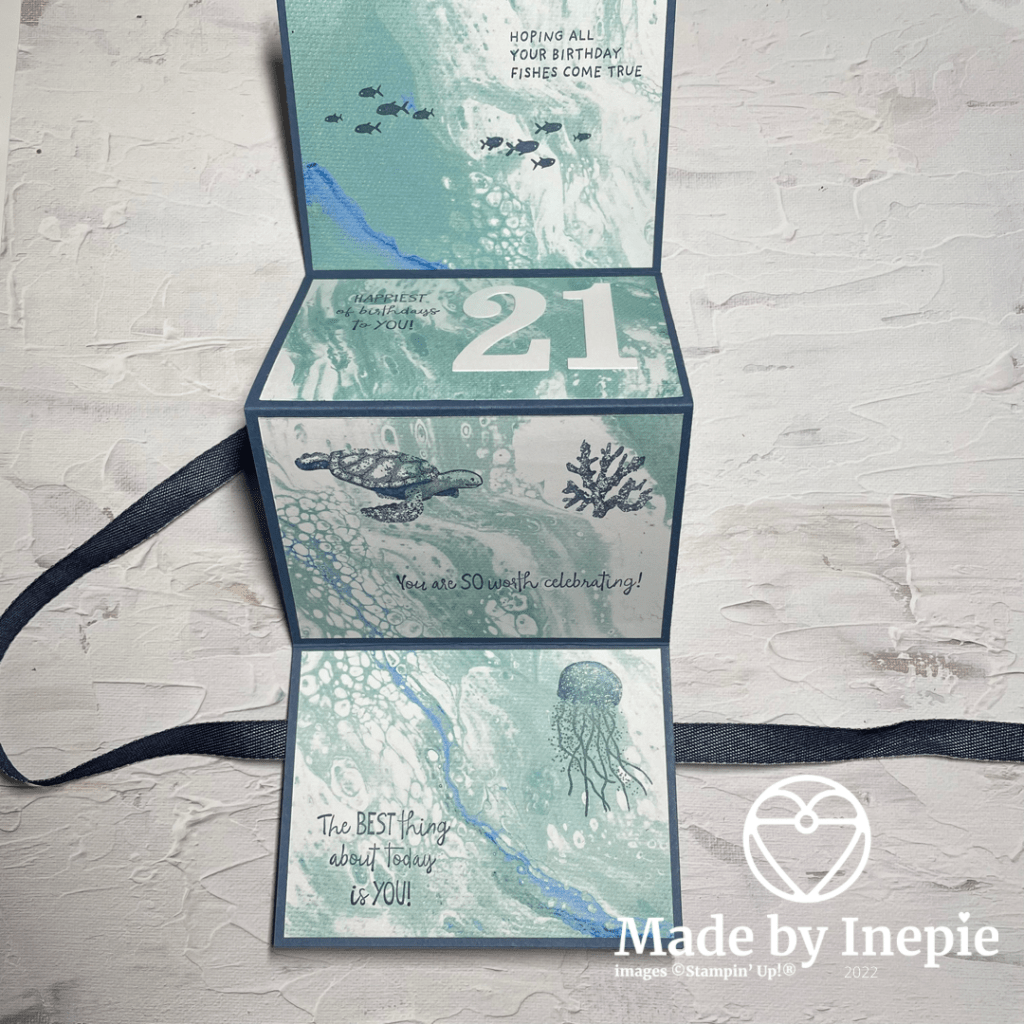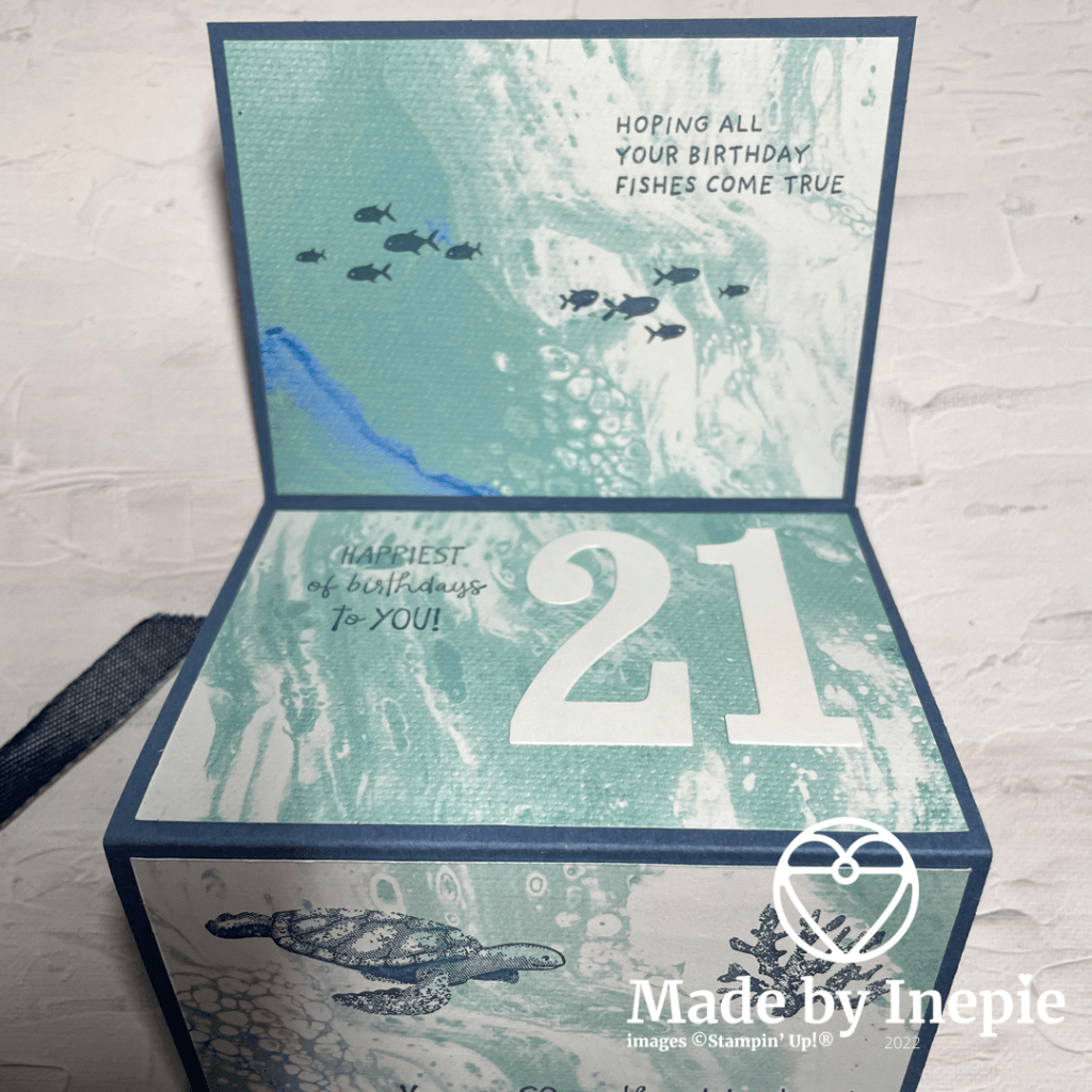 Dit is het kaartje wat ik voor Nick gemaakt heb. Het ontwerp had ik van een SOL die gegeven werd door mijn teamgenootje Geke. Het heet een wave card. En bij mij heb ik dat letterlijk genomen en het nieuwe Waves Of The Ocean Dsp gebruikt in combinatie met de Whale Done stempelset. Vooral ook om de teksten.