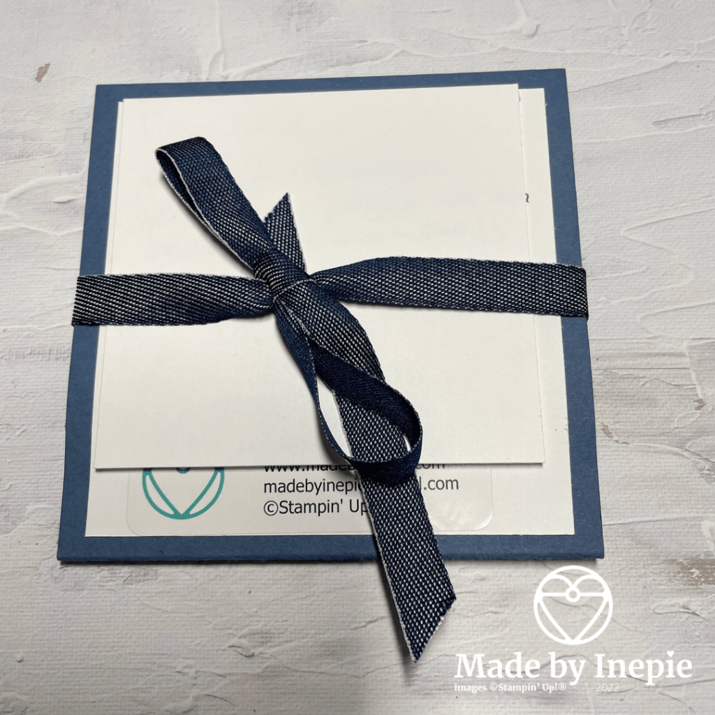 En je kunt er zo makkelijk op stempelen. Je sluit de kaart met een stuk lint. Ik heb er even een stukje basic white opgelegd om mijn geschreven tekst te verbergen.