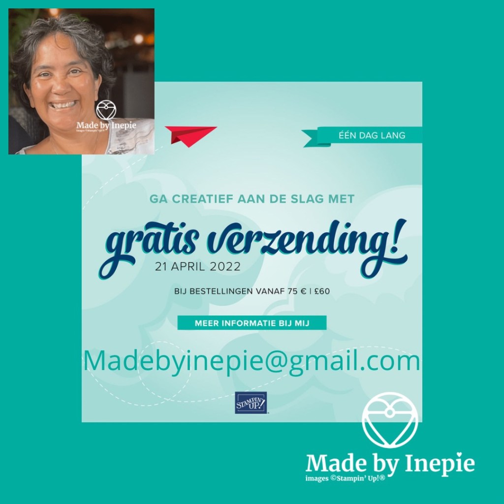 Aanstaande donderdag 21 april betaal je geen verzendkosten. Doordat alles duurder is geworden zijn de verzendkosten verhoogd naar €7,95 dus wees dlim en geef snel je bestelling door aan mij op madebyinepie@gmail.com. Of bestel die dag in mijn webshop: http://www.madebyinepie.stampinup.net