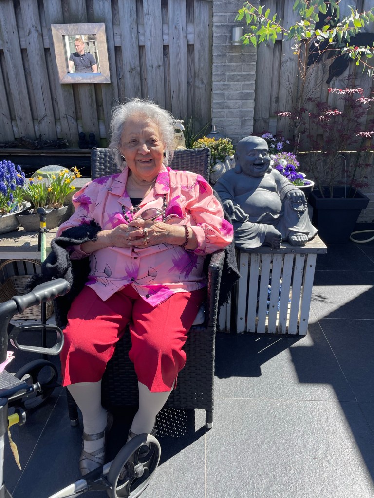 Vandaag weer geen creatief blog. De afgelopen dagen weer teveel gedaan met mijn tennisarm. Indisch eten gekookt en toch mijn moeder aan de arm genomen soms. En natuurlijk voor haar gezorgd. Gelukkig hielp Willem met de steunkousen uit en aan doen wat dat lukte mij niet. En hij duwde de rolstoel. Eerste paasdag gezellig met broer, schoobzus moeder en wat kids doorgebracht. Tweede paasdag met ons mam op stap geweest. Wat was het heerlijk weer en wat heeft ze genoten en wij dus ook. Voetbalwedstrijd van Nick, Groenrijk tuincentrum en het kerkhof waren de uitstapjes en daarna weer gezellig samen eten. Ze had ook heerlijk geslapen op onze mega slaapbank. Kortom dagen met een gouden randje.