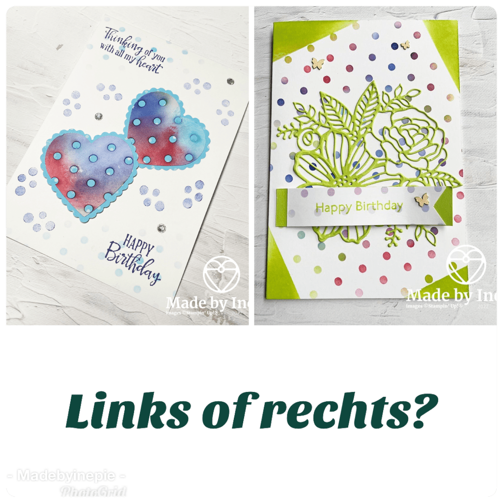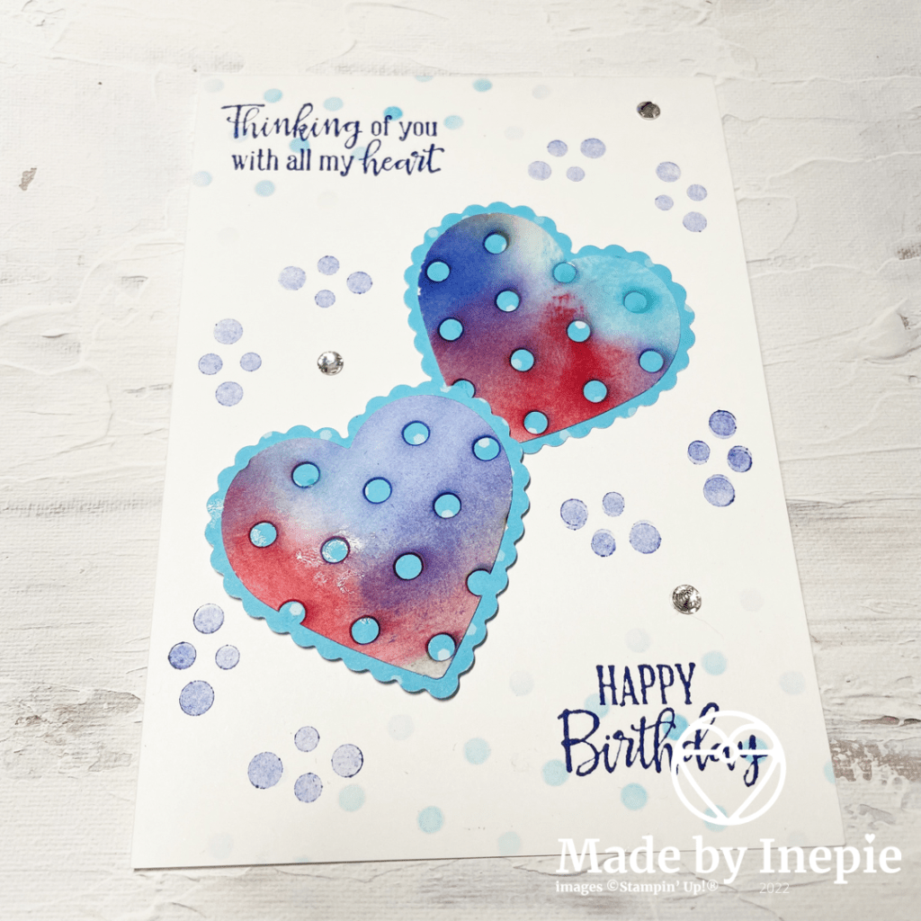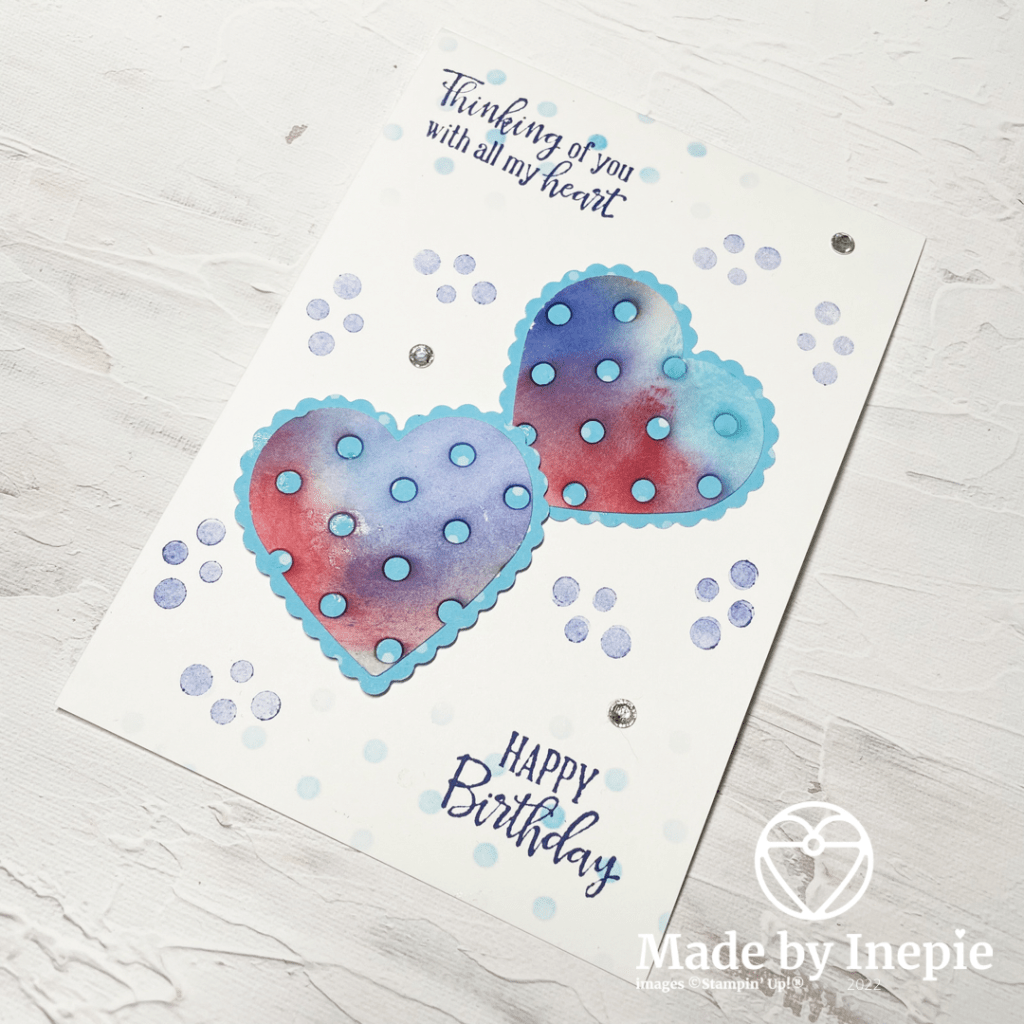 Ik plakte de harten met lijm en Dimensionals op een basic white basiskaart die ik te wit vond dus gauw een reststuk gepakt om nog wat stippen aan te brengen onder en boven. Met de stampin blends die nog op tafel lagen. Toen was het nog te wit naar mijn zin dus heb ik de stippen van het lieveheersbeestje uit de stempelset Geluksbrengertjes gebruikt. In Starry Sky inkt maar wel twee keer afgestempeld. Blingbling erop ( Basic Rhinestones ) en mijn restjes kaart was klaar. Superleuk dat ik met 1 techniek twee heel verschillende verjaardags kaarten heb gemaakt. Welke vindt jij mooier? Die van vandaag of die van gisteren?
