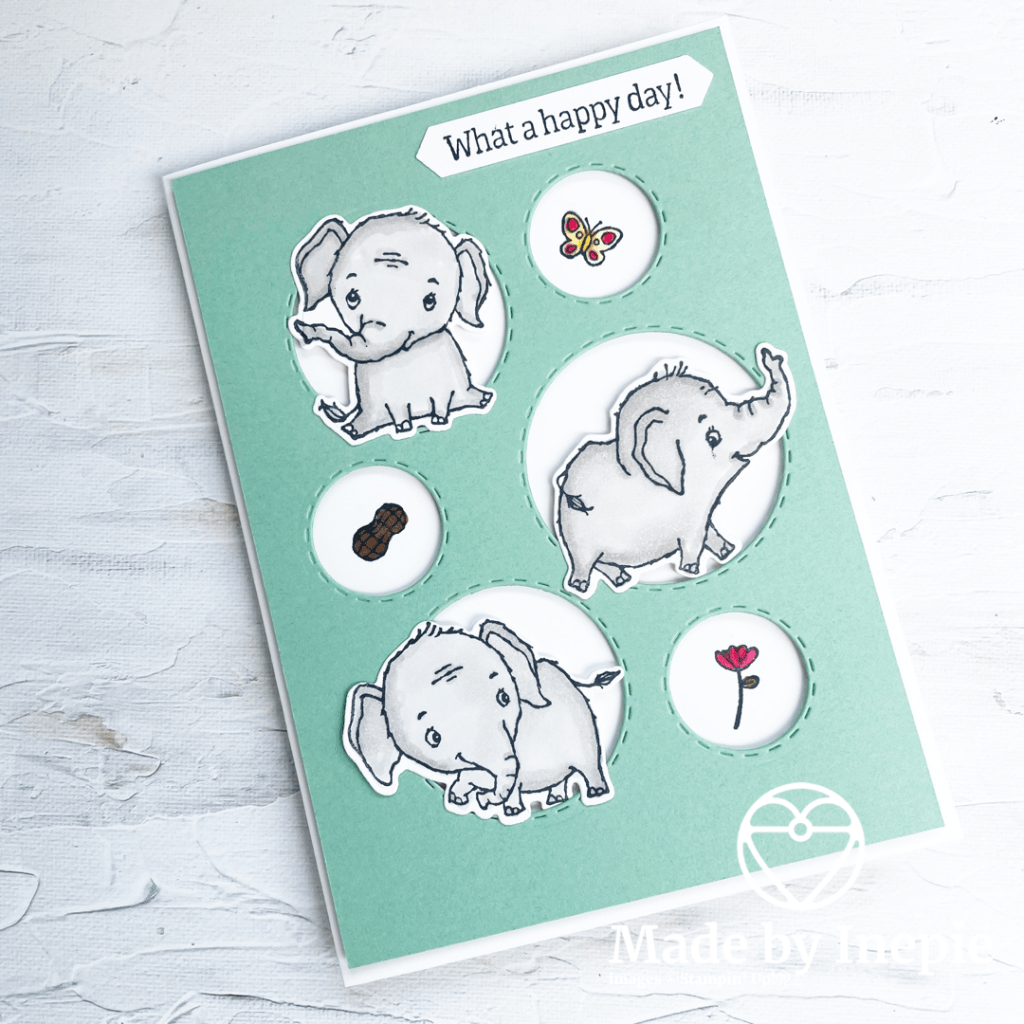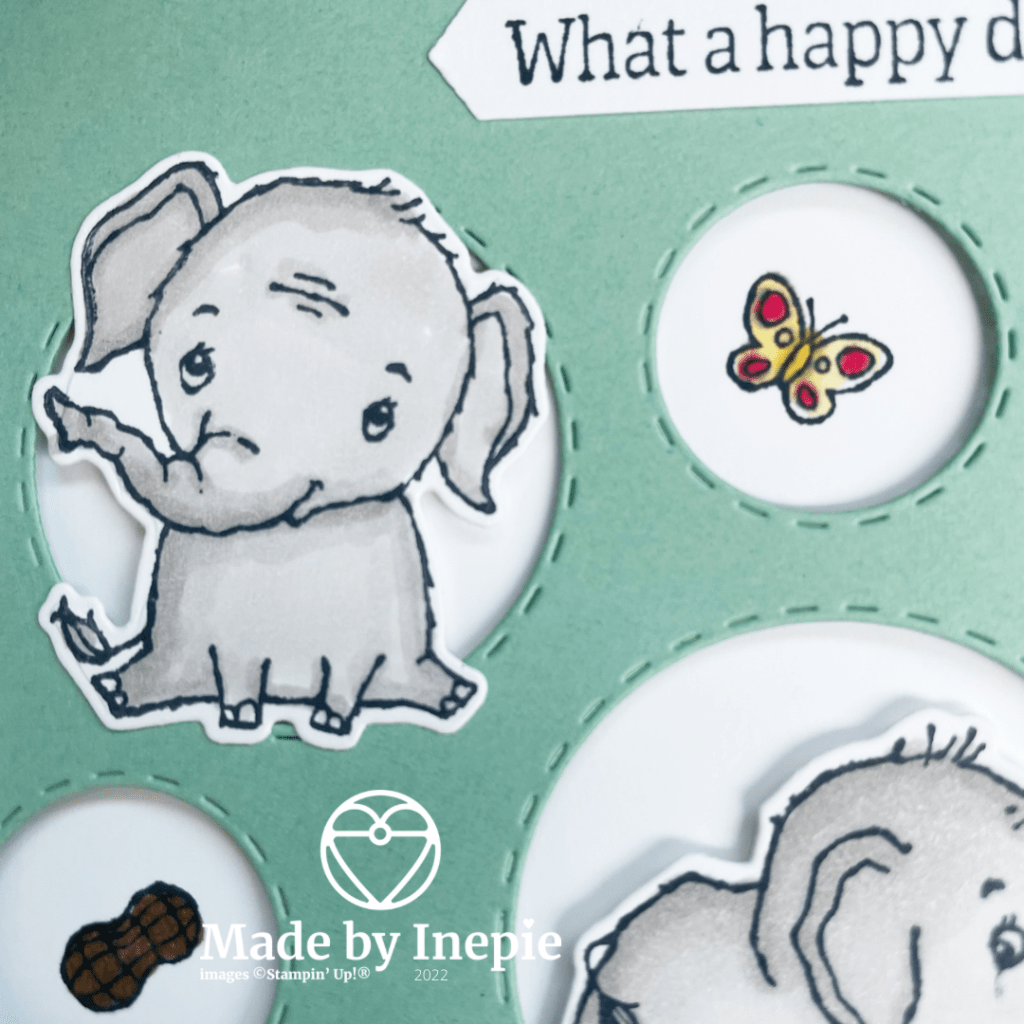 Ik heb de olifanten eerst op basic white cardstock gestempeld met memento black Tuxedo inkt. Want ik wilde ze inkleuren met mijn Stampin Blends. Daarna heb ik ze uitgestanst. Met de Picture This Dies heb ik uit een Mint Macaron stuk cardstock van 10 cm bij 14 cm de rondjes uitgesneden. Deze mat heb ik met Dimensionals op een basiskaart van 14,5 cm bij 21 cm( ril op 10,5 en vouw de kaart) geplakt. Daar toen de olifantjes ook met Dimensionals op geplakt en daarna de pinda, vlinder en bloem erin gestempeld en gekleurd. De tekst komt ook uit de stempelset.