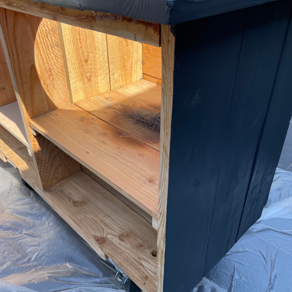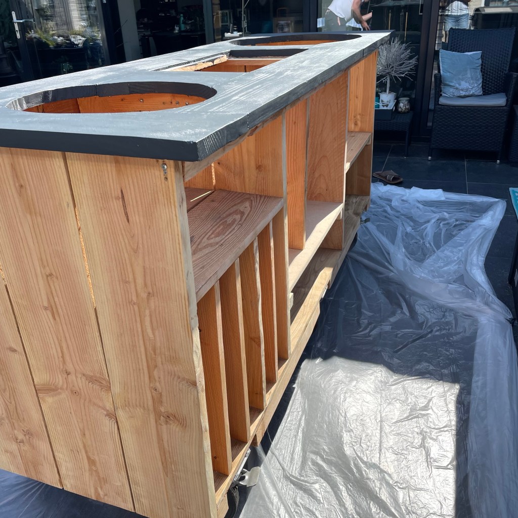 Vandaag is Willem aan het werken aan zijn plezier: zijn nieuwe buitenkeuken. Eert alle planken herstelt en gaten gemaakt voor de bbq’s. Een plek gebouwd voor het koelkastje en nu wordt er ijverig geschilderd. Want ik vond dat de keuken er mooier uitzag in Antraciet grijs en gelukkig vonden Willem en Johan dit ook hihi.