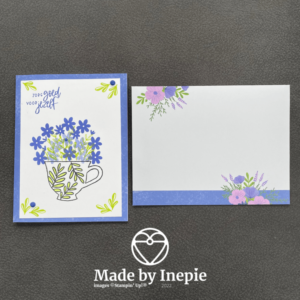 Ik koos de basiskaart in Orchid Oasis en op een mat van Basic White heb ik toen met de Thee en Troost stempelset het theekopje, de tekst en de bloemen en blaadjes gestempeld.