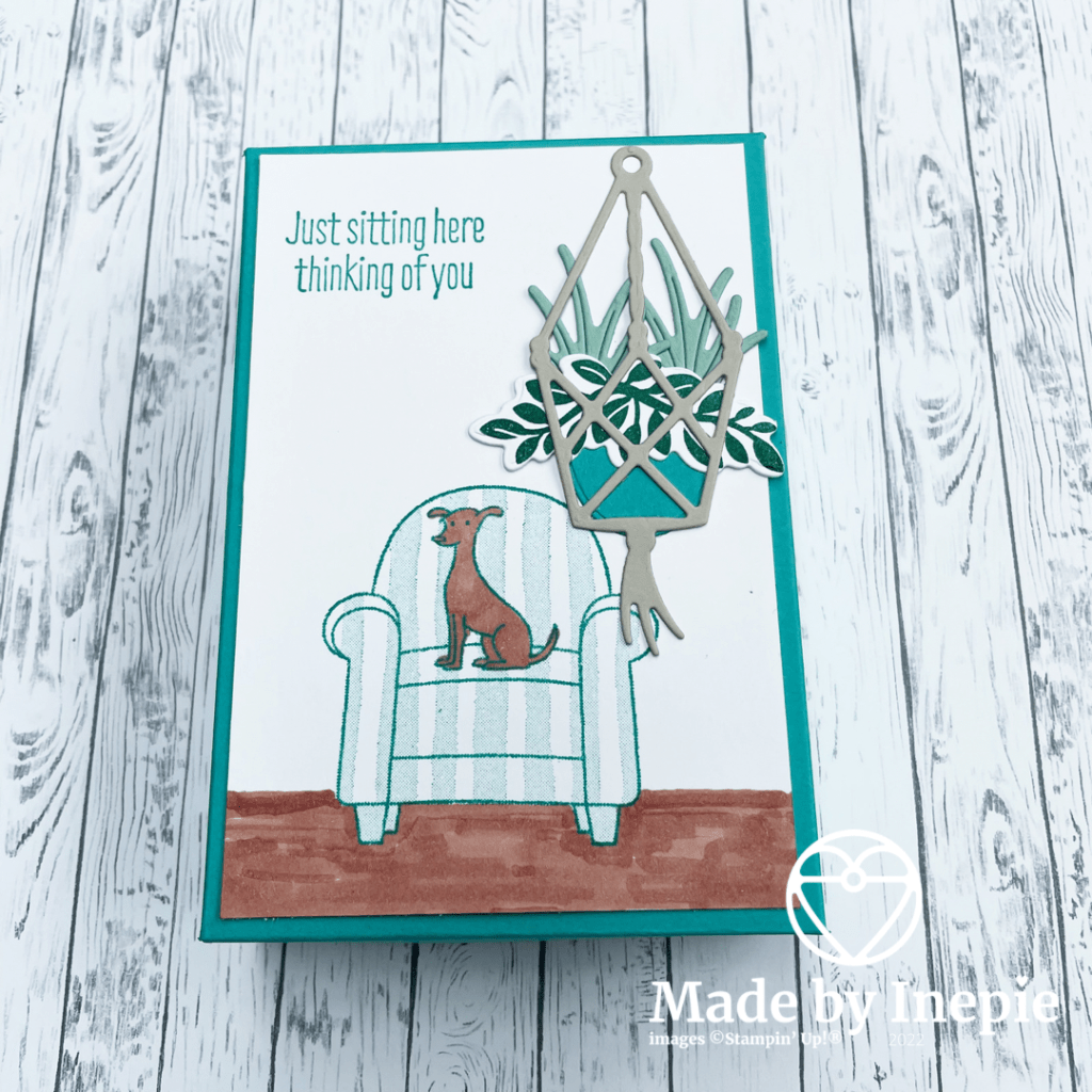 Superleuk toch? De stoel met hondje en de tekst komen uit de nieuwe Host set : Sit Stay Relax. Als je een bestelling doet van €200,00 of meer krijg je Stampin Rewards en daar kun je speciale Host stempelsets van kopen of zelfs Dsp. Je vindt deze op pagina 179 van de nieuwe jaarcatalogus.