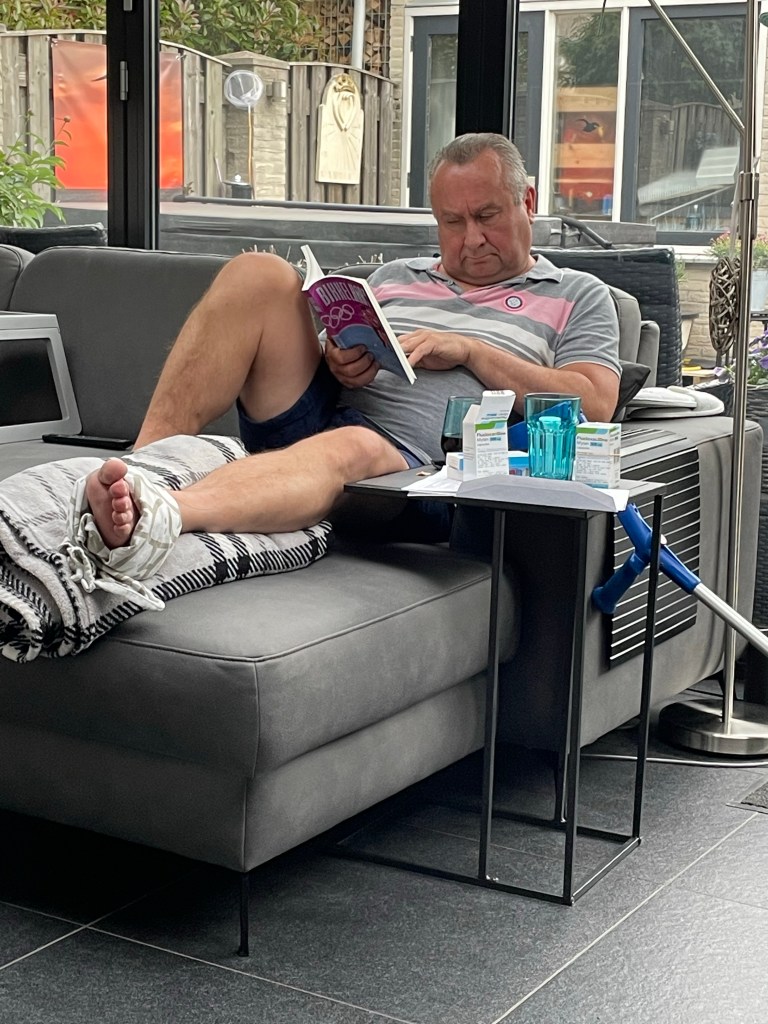 Willem had opeens avonds een hele dikke teen en voet gekregen die rood zag en warm aanvoelde. Dus vanochtend naar de huisarts gegaan. Bleek hij ipv griep, wondroos te hebben. Dus flinke antibiotica kuur gekregen en been omhoog en koelen. Mijn Willem is geen lezer in tegenstelling tot mijzelf ( boekenwurm) maar ik zei: “nu heb je mooi tijd om Marcels boek te lezen”. En wonderbaarlijk: hij heeft al een kwart van het boek uit.