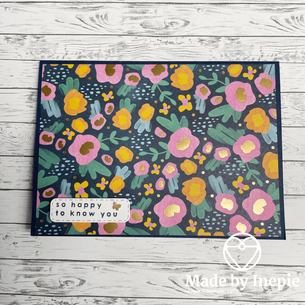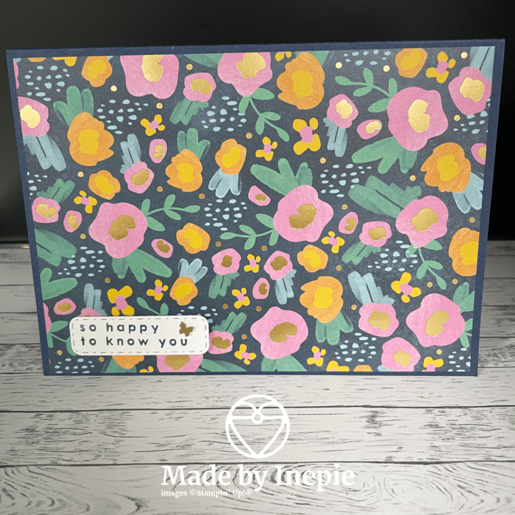 De basiskaart kaart is in Night of Navy en daar heb ik de mat van Dsp opgeplakt. Het papier is zo mooi dat het niet meer nodig heeft dan een sentiment en een vlindertje voor de Blingbling.