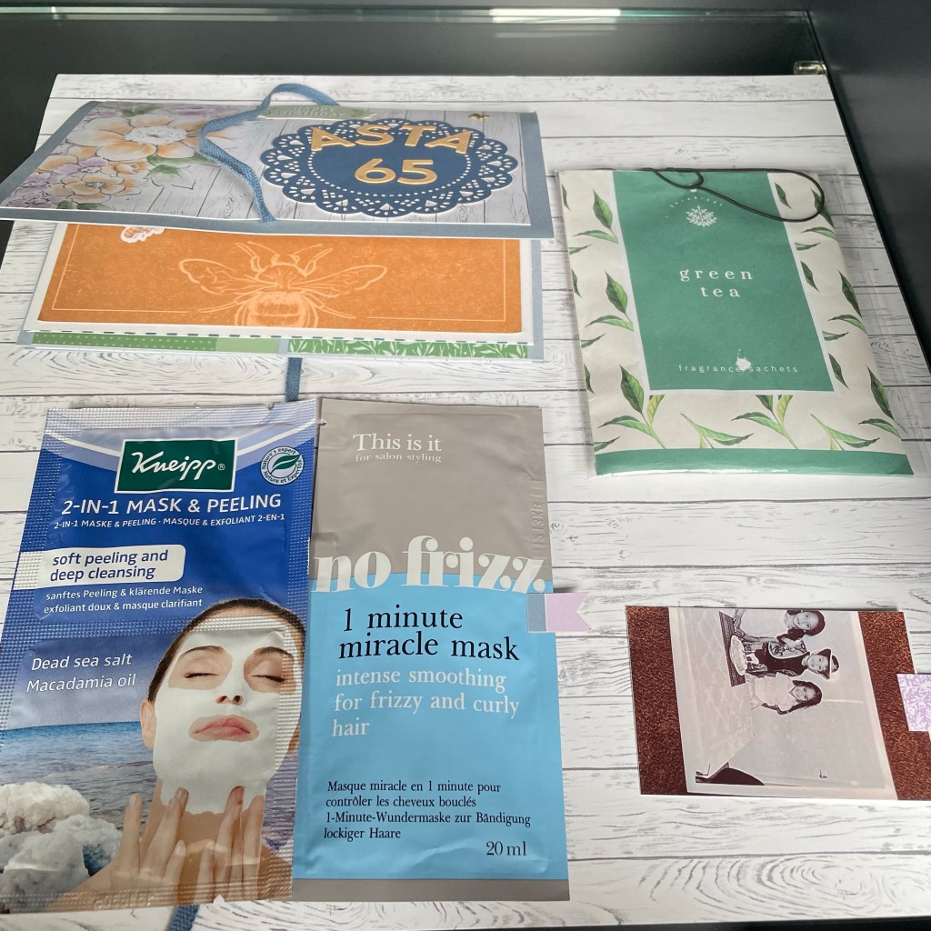 Hier heb ik drie kleine memories and more kaarten gebruikt en wat stickers. In het bakje zit een gezichtsmasker