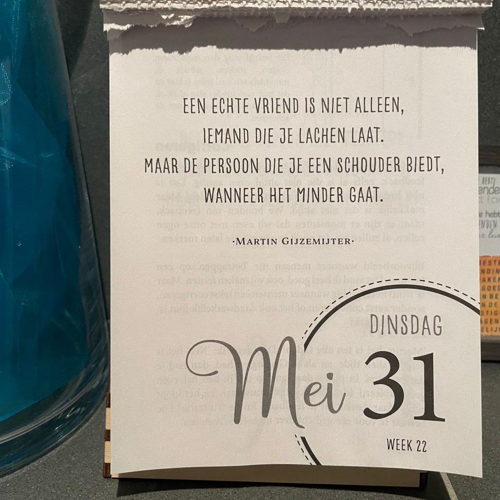 Kijk deze van vandaag is weer zo goed. Zijn scheurkalender staat op de wc zodat iedereen het kan lezen. Vaak bewaar ik ze ook als tekst voor in een kaart. Het bijzondere van dit boek is ook dat achterin de namen staan van mensen die vooraf het boek hebben ge-preorderd en besteld. Dus mijn naam staat er ook tussen: hoe vet is dat.