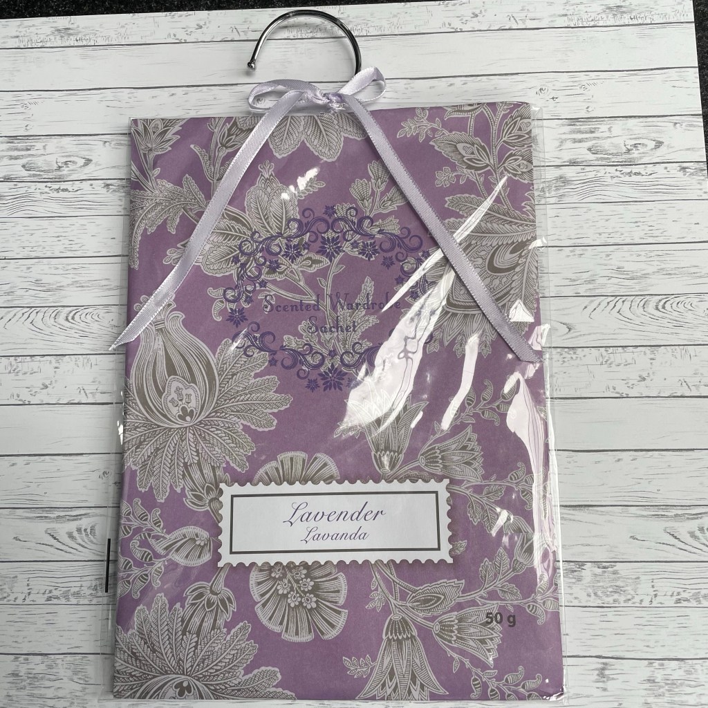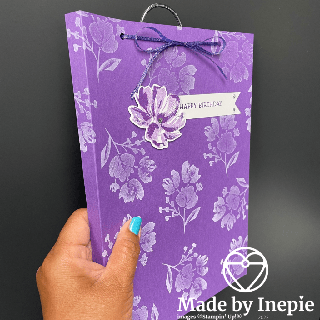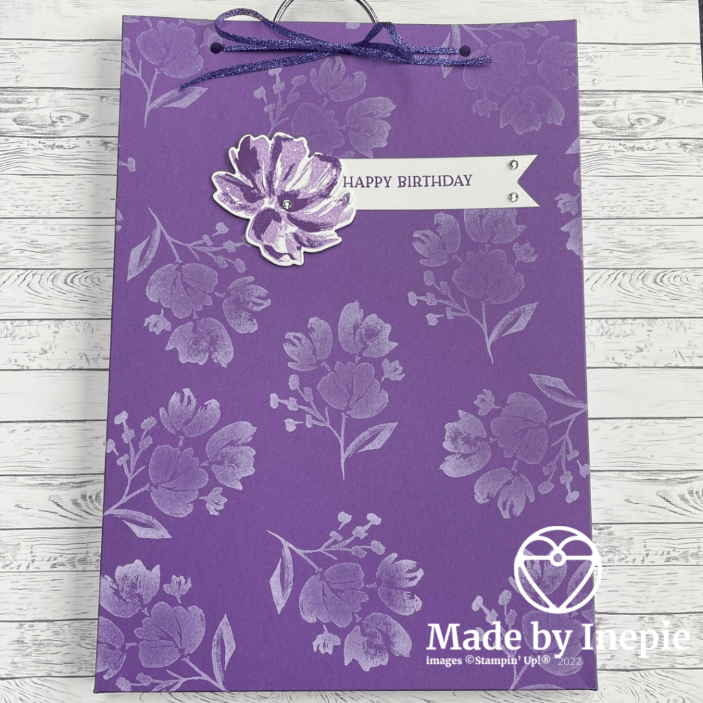 Ik had dit leuke geurzakje gekocht en wilde hier een verpakking om heen maken. Ik heb 2 vellen A4 cardstock gebruikt in de kleur Gorgeous Grape. Daar heb ik eerst met witte Craft inkt opgestempeld. Ik gebruikte de mooie bloemen uit de Art Gallery stempelset. Ik heb het zakje opgemeten en aan drie kanten van beide A4 vellen op 1,5 cm gerild. En ze op elkaar geplakt als een hoesje. Ik vond het leuk als het hangertje wat uitstak en heb dus van de bovenkant nog een randje afgesneden.