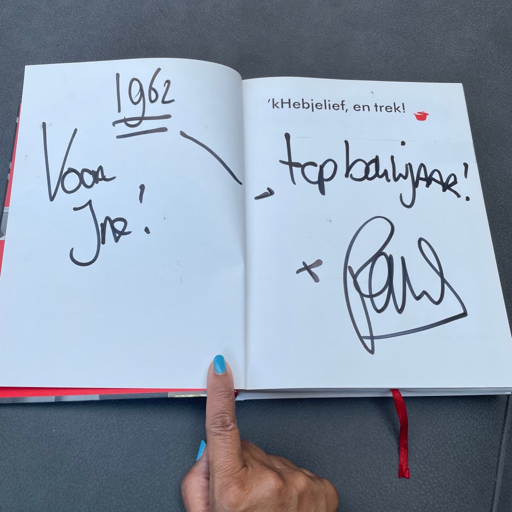 We waren naar zijn theatershow geweest en naderhand heeft hij het boek voor mij gesigneerd. 50 werden we beiden dat jaar en nu dus alweer 60.Wat vliegt de tijd. Het is een geweldig boek met verhalen en recepten. Dus blij dat ik het eindelijk uit de kast heb gepakt.