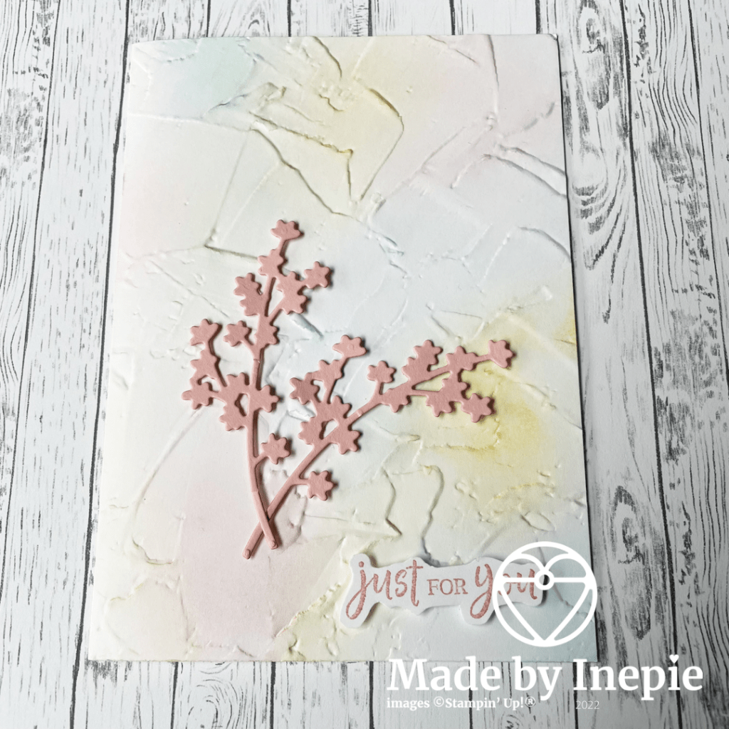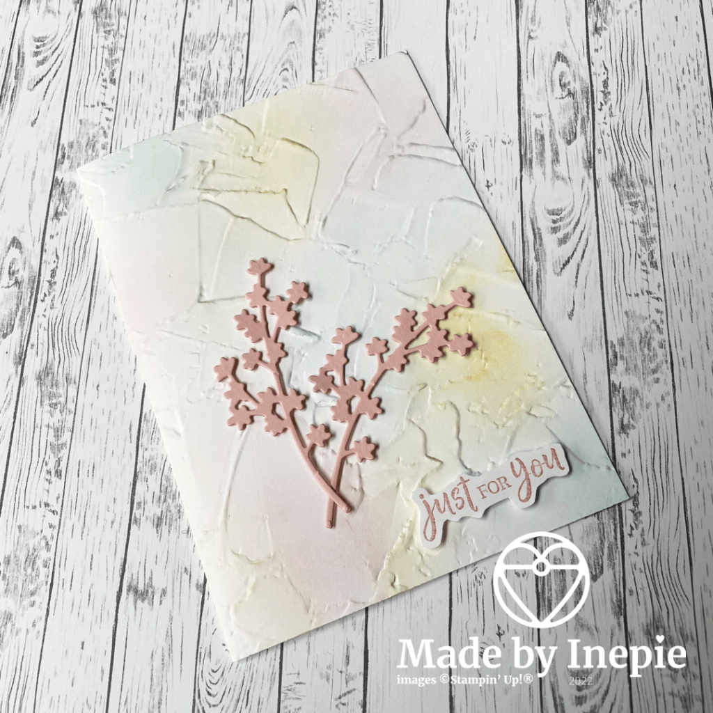 Vandaag ook een kaartje met bloemen. Ik heb eerst de Basic White basiskaart door de Painted Texture 3D Embossing folder gehaald. Toen met mijn Blending Brushes de kleuren So Saffron/ Blushing Bride/ en Balmy Blue aangebracht heel subtiel door deze zachte kleuren,