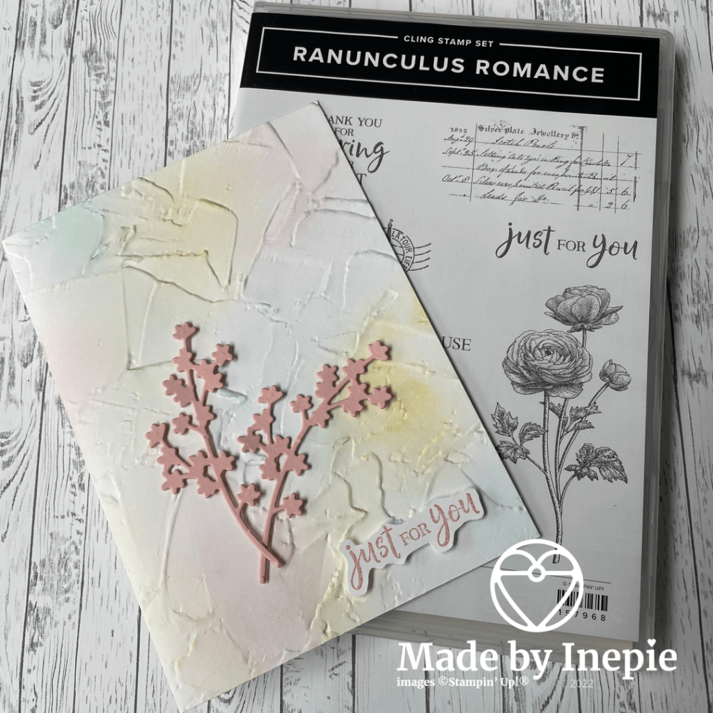 Het bloemetjes takje komt uit de Ranunculus Dies die horen bij de stempelset Ranunculus Romance die gelukkig mee ging naar de jaarcatalogus.