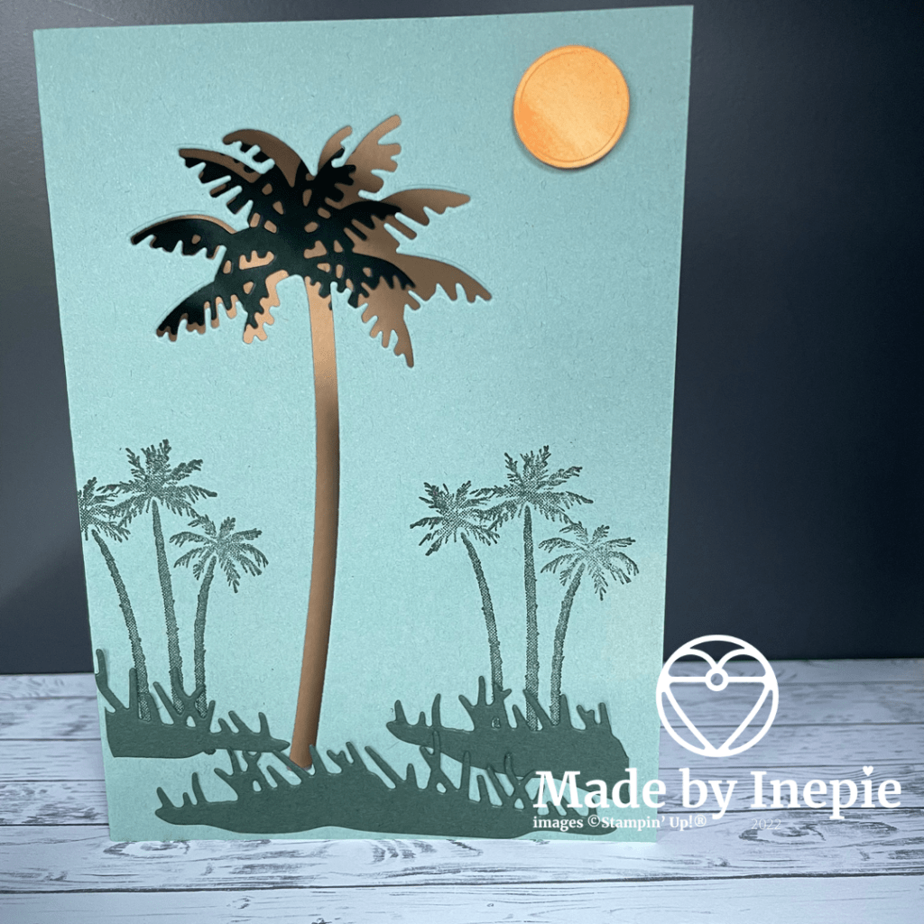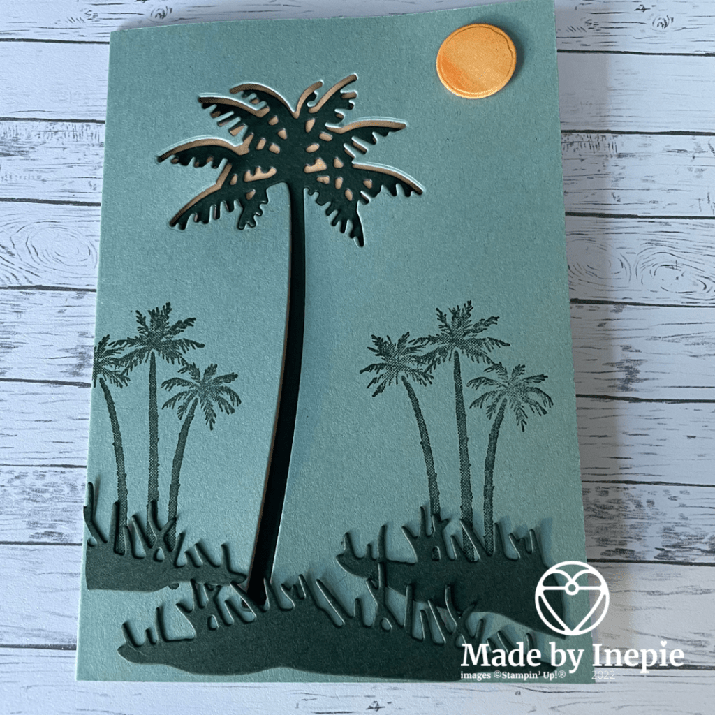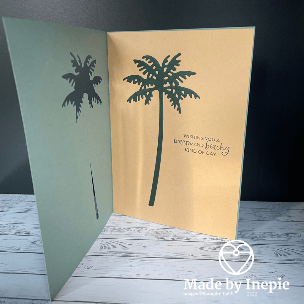 Ik heb eerst uit een basiskaart van Soft Succulent de grote palmboom gestanst. Toen een andere Palmboom uitgestanst uit Evening Evergreen Cardstock. In de binnenkantvan de kaart een mat geplakt van Pale Papaya Cardstock. En toen door de opening de palmboom op zijn plaats geplakt