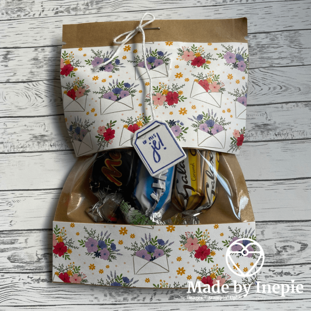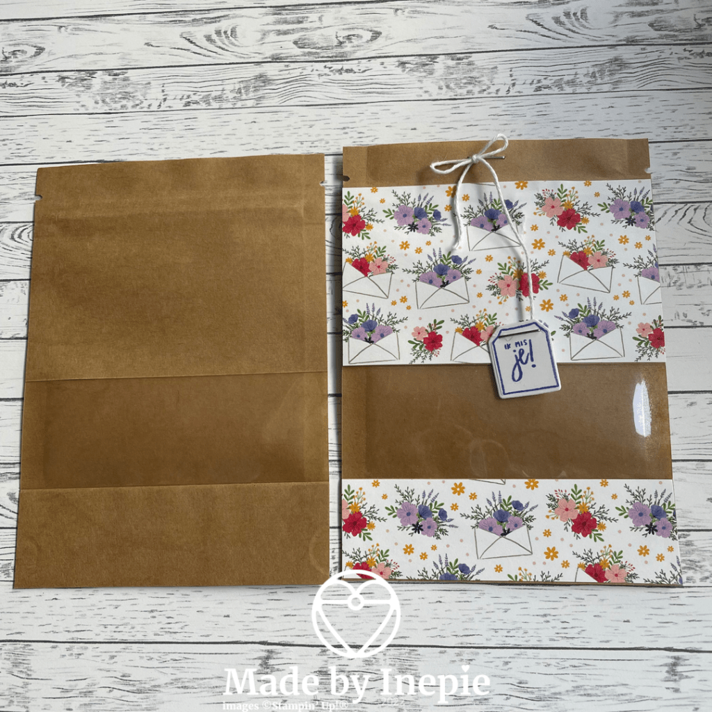 Een product wat je misschien niet opvalt in de jaarcatalogus is op pagina 140 de Peekaboo Treat bags. Leuke kleine zakjes in craft en wit papier met een zipp lock sluiting. Er kan niet heel veel in maar je kunt ze leuk bestempelen of zoals ik gedaan heb beplakken met Dsp.