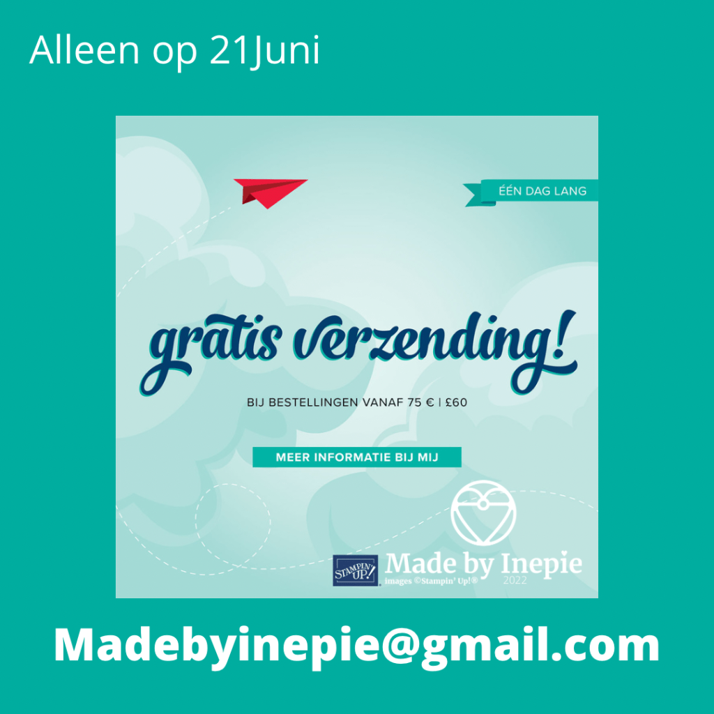 En meteen is mijn aanrecht een stuk leger: dat geeft ook rust. En meer werkplek. Ook heb ik een grote keukenkast aangepakt: veel dingen weggedaan of weggegooid. Ik kijk tegenwoordig de Home Edit en daar krijg je leuke ideeën van. Het lukt me denk ik niet het zo strak en georganiseerd te krijgen zoals bij hun. Iets op dezelfde plek terug zetten blijft moeilijk voor een aantal kids. Maar dit gaf mij weer een opgeruimd en goed gevoel en daar gaat het om. Helaas dus geen tijd gehad om te knutselen hopelijk morgen weer wel. We hebben ook weer een mooie actie bij Stampin’Up! Morgen 21 juni ( alleen die dag) betaal je geen verzendkosten bij een bestelling van minimaal €75,00 scheelt je toch €7,95. Geef je bestelling gauw door op madebyinepie@gmail.com of bestel in mijn webshop: