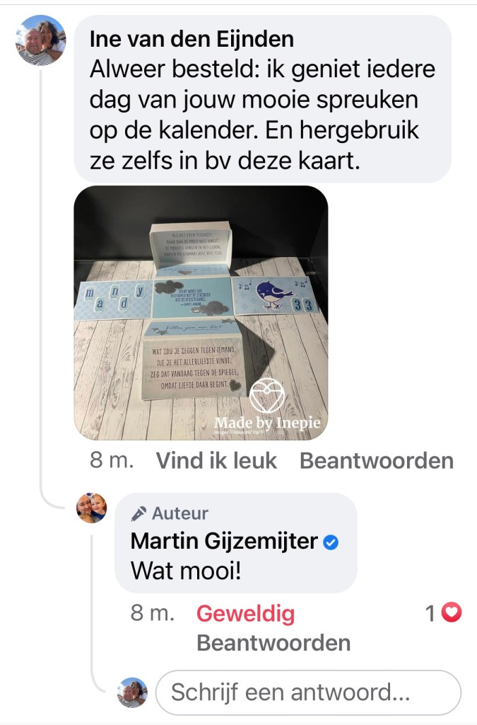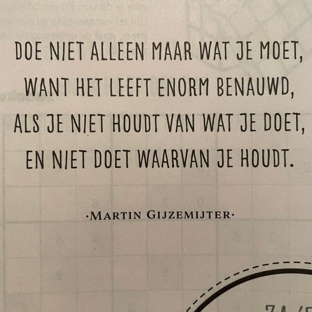 Deze mooie spreuk stond vandaag op mijn scheurkalender van Martin Gijzemijter. Ik ben echt fan van hem en iedere dag zo’n mooie spreuk geeft me weer iets om over na te denken. Ik heb net zijn nieuwe scheurkalender al gepre-orderd. En kijk hij vond mijn reactie leuk:
