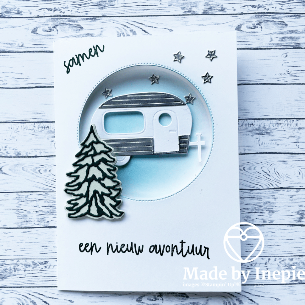 Zo leuk die caravan. Ik heb een cirkel uit de Stylish Shapes Dies gebruikt om een doorkijk te maken in een basiskaart. Daarna heb ik met een Blending brush wat Balmy Blue inkt aangebracht door de cirkel heen. De boom bestaat uit twee stansen en heb ik op de voorkant van de cirkel geplakt met Dimensionals. De sterretjes en het dak en de onderkant van de caravan heb ik uit zilver folie gestanst.