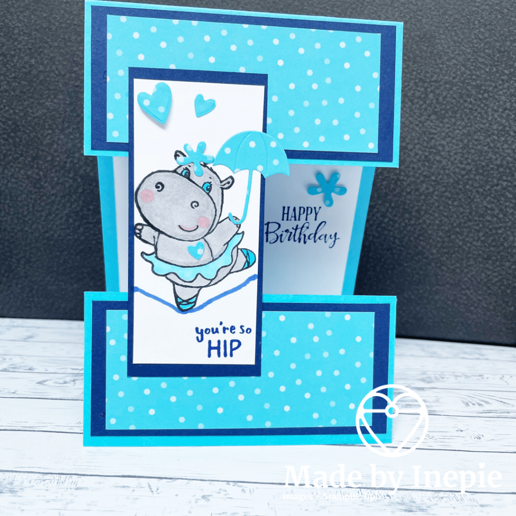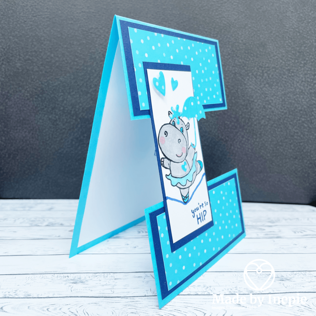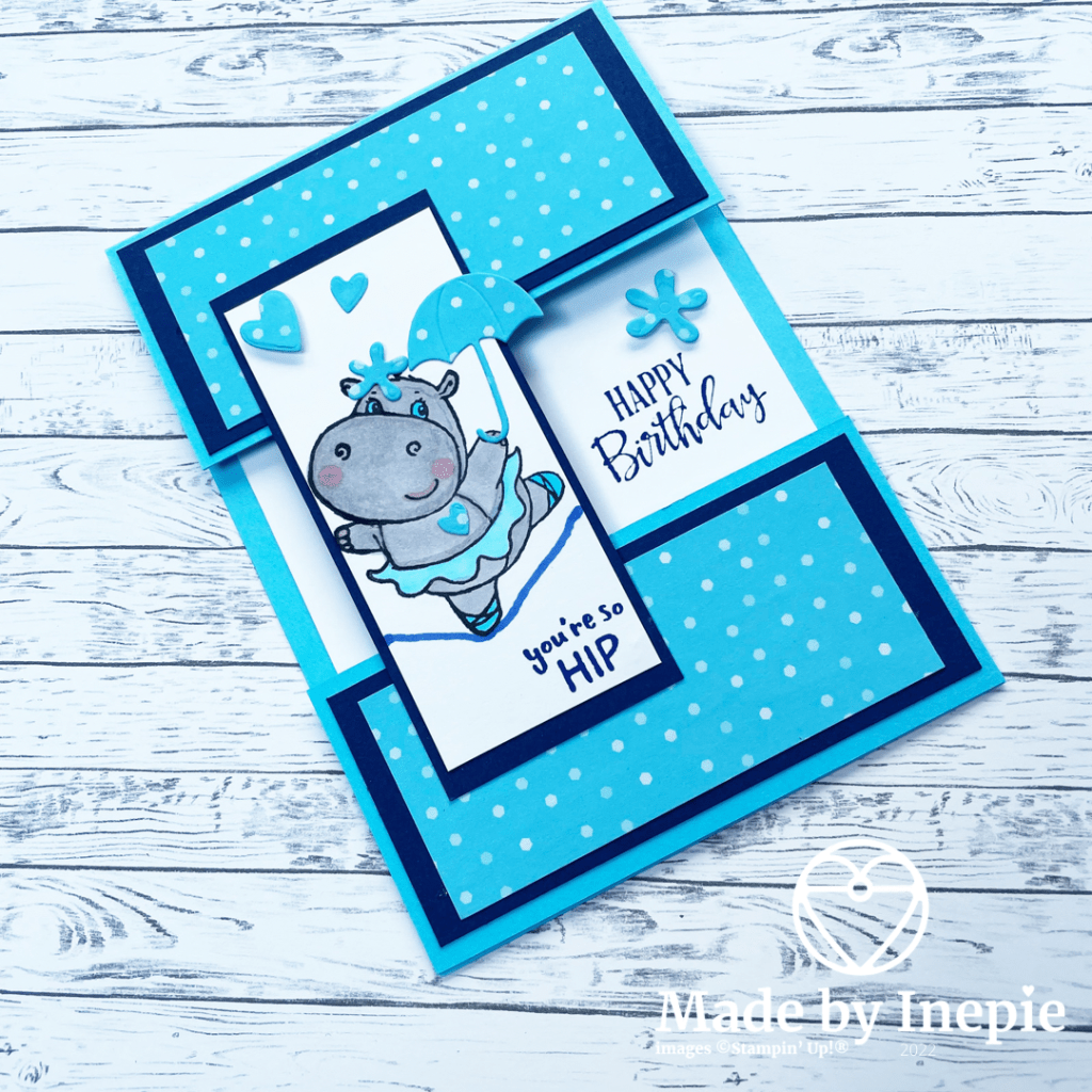 Dit schattige kaartje had ik als voorbeeld gemaakt. Dit model hadden we vorige maand als teamswapkaartje en had ik de olifantjes gebruikt. Nu dus de geweldig Hippo’s die je nu tijdens Sale-A-Bration gratis mag uitzoeken. Bestel je nog een keer voor €60,00 dan kun je de bijpassende Dies erbij kiezen. Zo leuk dat parapluutje, de bloemen en de hartjes. Ik help jou graag.