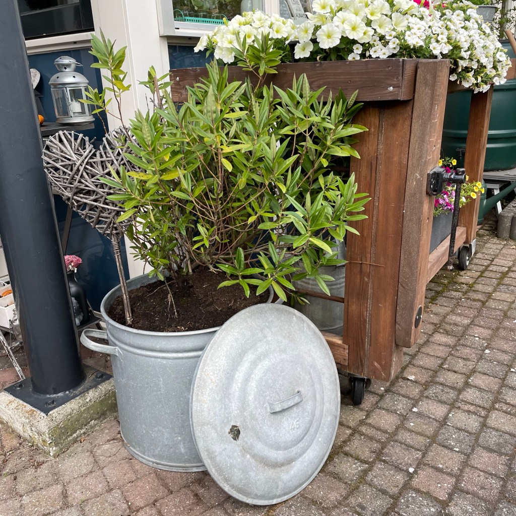 Daarna hebben we Teun thuis afgezet en zijn we naar de Intratuin gegaan want de voortuin was niet naar mijn zin. Nadat de werkbank zo’n mooi plekje had gekregen wilde ik de rest ook aanpakken. Allereerst vulden we de grote zinken bak die ik van mijn zus Gwen kreeg met de Vlinderstruik.