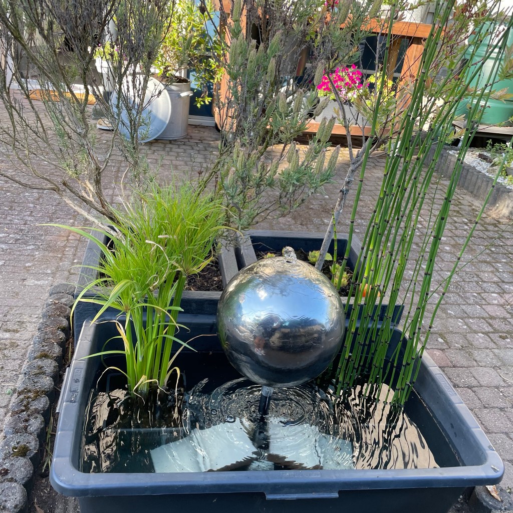 Toen moest onze vijver met water ornament aangepakt worden. De visjes zwemmen allang in de vijver in de achtertuin en de waterbol hadden we uitgezet. We wilden de houten bak rechtzetten want hij was verzakt maar het hout bleek verrot en de houten ombouw hebben we dus weggedaan. Nu twee vierkanten bakken die er naast stonden in de stenen rand gezet en de vijverbak ervoor gezet. Twee waterplanten erin en de bol: super mooi weer. Deze bol is de erfenis van mijn schoonmoeder ( Willems moeder) en ik ben blij dat hij nu weer zo mooi staat te shinen.