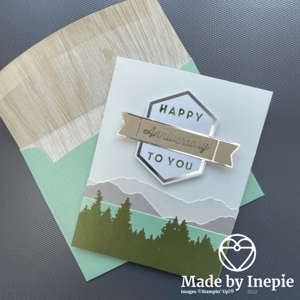 Er zit een kleine Mossey Meadow inktspot in en een stempelblok. Dimensionals en alle stansen en kaarten en enveloppen. Een compleet pakket dus.