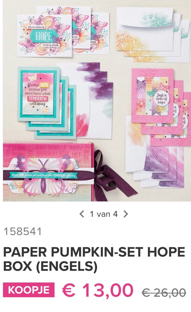 Superleuke kaarten toch? Binnenkort laat ik zien hoe je met deze kit en producten die ik al in huis heb de kaartjes net anders kunt maken. Deze creatieve sets zijn superhandig om mee op vakantie te nemen, alles zit erin. Al adviseer ik wel om een papersnips, bonefolder en Tombow liquid glue extra in de doos te doen. Er is nu een hele mooie Paper Pumkin box in de aanbieding bij het vernieuwde koopjesrek: