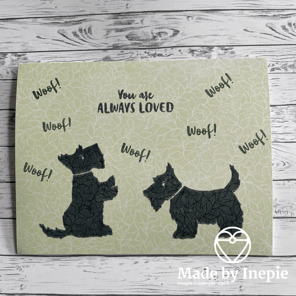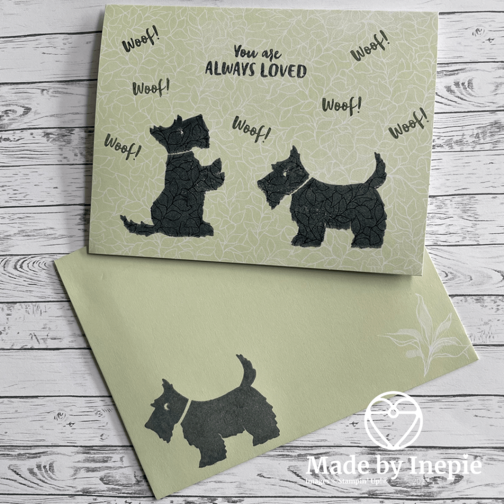 He kaartje van vandaag heb ik gemaakt met de gratis uit te zoeken Pool Party & Soft Seafoam cards & envelops uit de Sale-A-Bration folder. Bij een bestelling vanaf €60,00 mag je die gratis hebben. Ik heb de kaart en de envelop in mijn Stamparatus gedaan voor een mooie zwarte afdruk vd hondjes. Ook de tekst You are Always Loved heb ik met de Stamparatus gestempeld. Daarna de tekst Woof! Lekker uit de losse hand gestempeld.