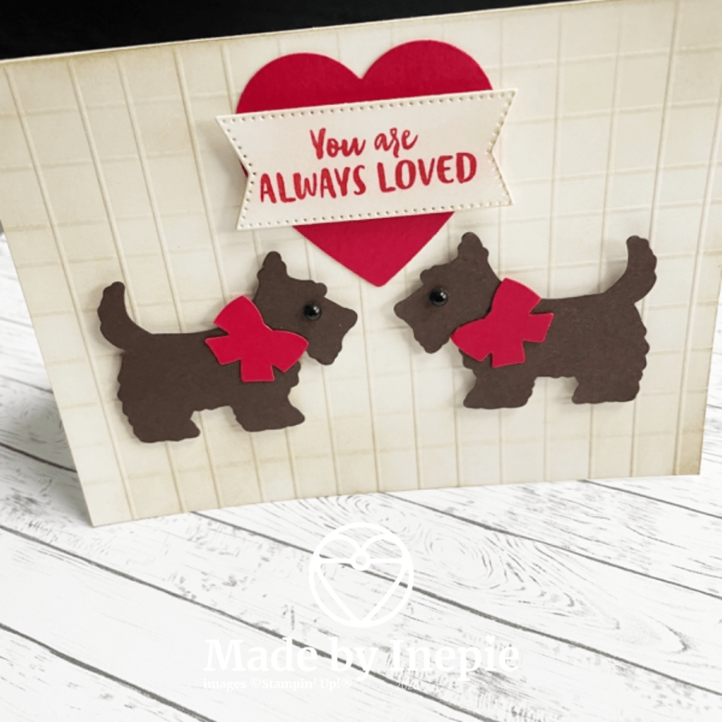 Zoals gisteren beloofd hier een kaartje waarbij ik de pons gebruikt heb. Ik heb eerst de basiskaart met behulp van mijn trimmer van rillijnen voorzien. Super leuk effect alsof het een muur is. Dan deze witte basiskaart met Sahara Sand inkt en een Blending Brush wat kleur gegeven. Zodat de lijnen meer opvallen.Met de Scottie Dog pons twee hondjes uit Early Espresso cardstock geponst en de strikjes uit Real Red cardstock. Ook het hart is uit Real Red cardstock en heb ik met de hart pons gemaakt.