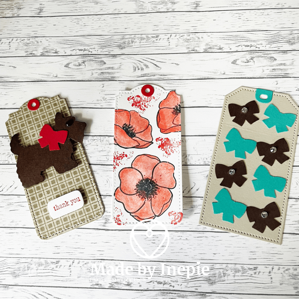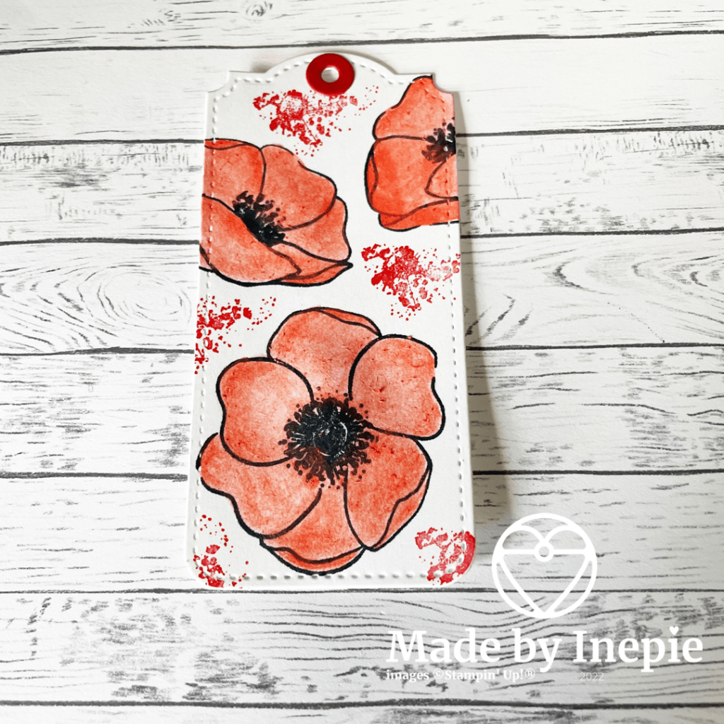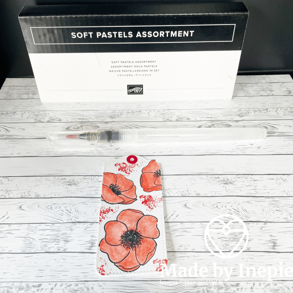 Van reststukjes cardstock kun je heel gemakkelijk labels maken met de Tailor Tag Dies. Ik heb eerst een Basic White label uitgestanst. En toen met Memento inkt de Painted Poppies gestempeld. Toen op een reststukje cardstock met de Soft Pastel krijtjes wat rood gekrast en met een Aquarel penseel de kleur opgepakt en de bloemen ingekleurd. Heerlijk rustgevend om te doen.